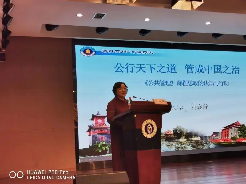 我院姜晓萍教授结合自身教育实践,以《公行天下之道,管成中国之治》为题,从认知本来、领悟原来、面向未来三个角度对思政教育建设做出全面分析。