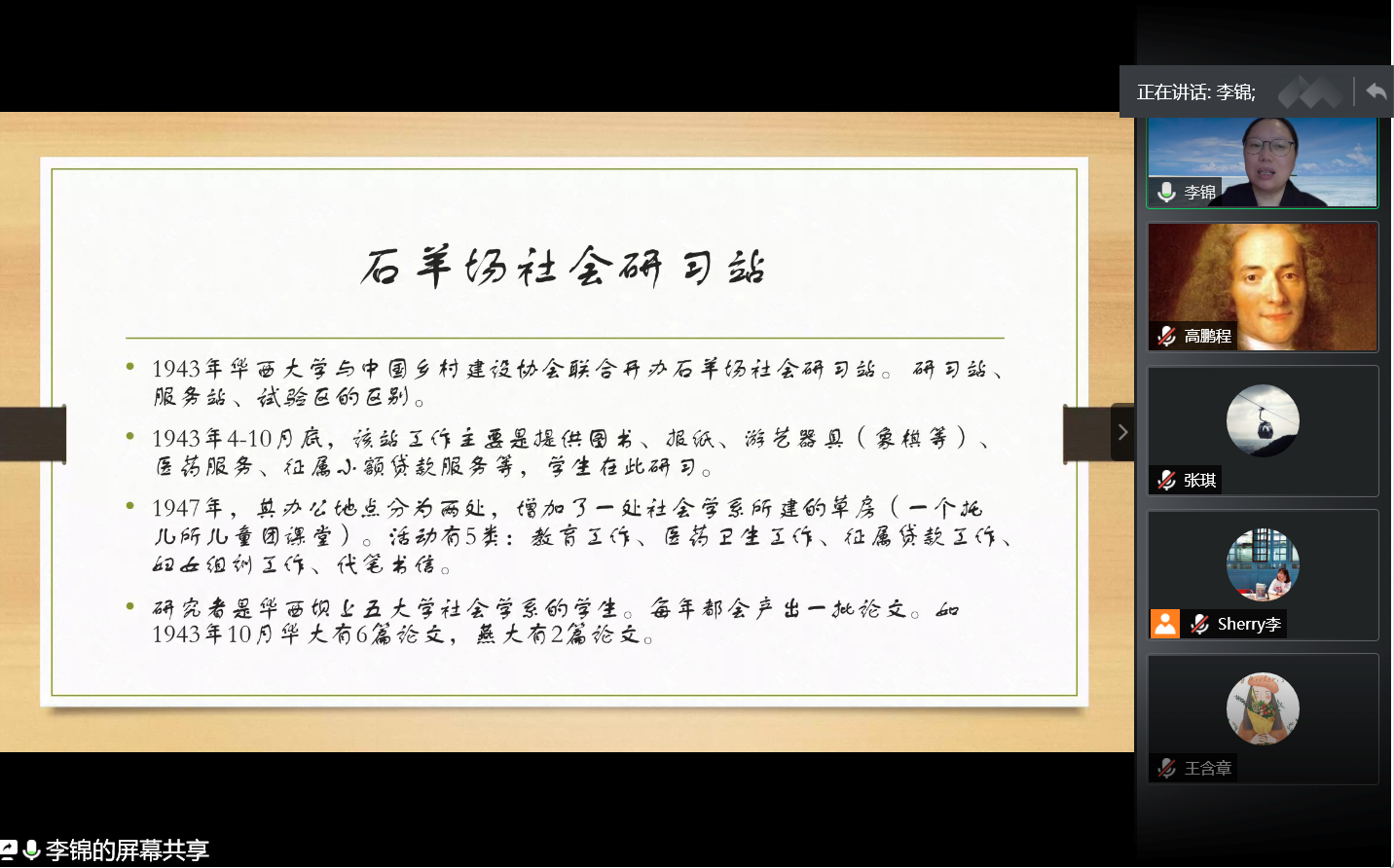 在讲座的问答环节,师生们就“社会学如何更好地传承”“社会学该怎样接地气” 等问题与李锦教授进行了深入的交流。倾听历史回响以服务社会,植根中国现状以发展社会学,李锦教授对华西社会学研究的发展回顾,使大家对社会学西部研究的传统与精神形成了深入、全面、系统的理解。老师和同学们一致认为,ok138cn太阳集团社会学现在的研究聚焦于民族/宗教研究与边疆社会学、乡村社会学与扶贫研究、城市社区研究与社会工作等,是对百年华西社会学研究传统的继承和发展。在讲座结束之际,所有与会者用热烈的掌声在云端向李锦教授表达了诚挚的感谢。