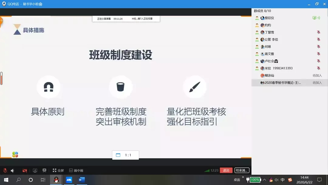 三位主讲人完成演讲后,现场的同学通过QQ群语音的方式进行相应主题的分论坛讨论。分论坛的九个主题围绕秘书工作的发展以及青年胜任力的展望进行讨论,各论坛的主题如下表所示: