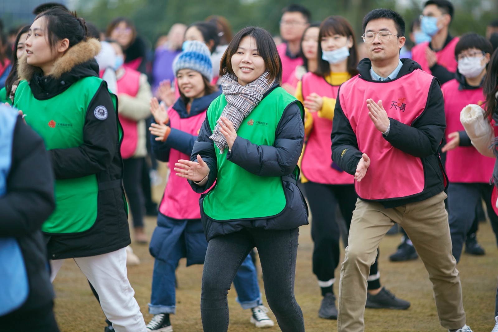 在初步构建彼此信任基础上,在心理和体能得到充分准备后,8支队伍分为两组进行团队竞赛大比拼。竞赛中,无论是“跨越沼泽”还是“旱地龙舟”,都展现出团队间彼此信任、相互帮助。在合作中,有的同学主动站出来指挥队员分工协作;有的同学思路清晰,积极支招;有的同学活泼开朗,负责气氛带动,加油号子喊得十分响亮。一番激烈的竞技比赛后,同学们的默契度和信任感得到增强。最后,近400名同学再次汇聚一起,共同拾起两圈坚实的长绳,手牵手、肩并肩组成人墙,开始了体力与毅力的终极考验项目——众人划桨士气高。活动中,所有人需用力紧绷身前长绳,8名队长站在绳上环绕一圈扮演“船长”角色,伴着激昂的音乐和长绳“海浪”,“船长”要在绳子上前行。此项团队合作活动,即锻炼胆识,又熔炼团队精神。