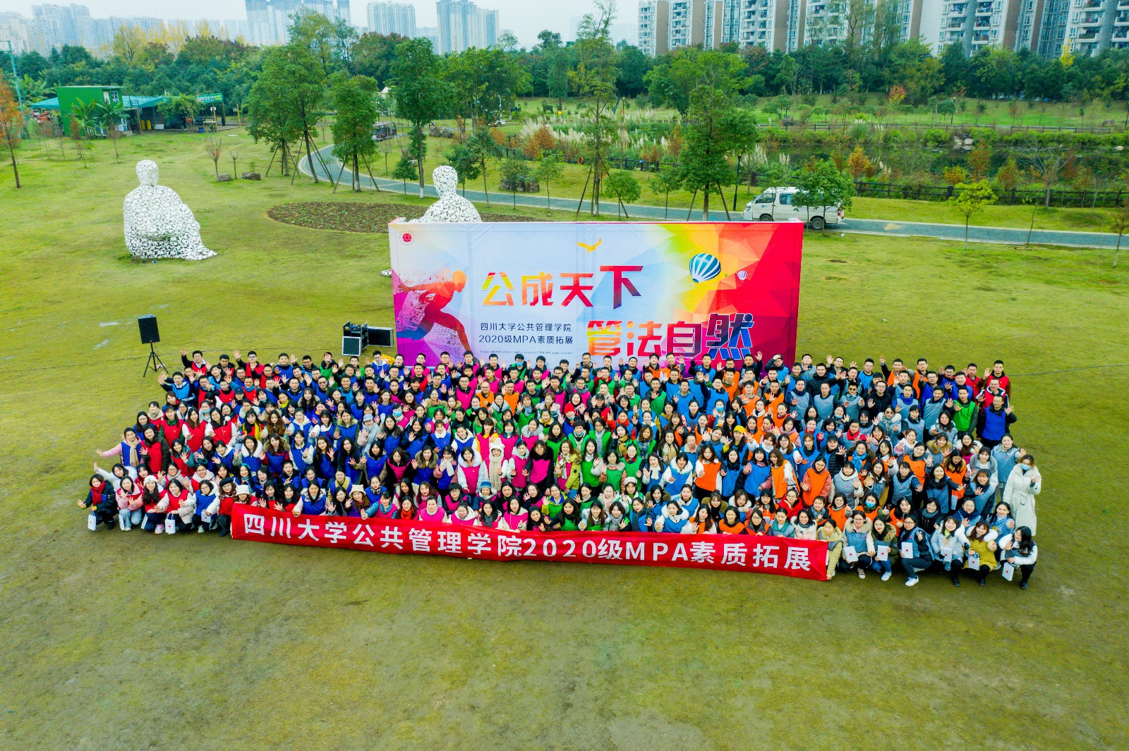 在本次素质拓展结束之际,全体同学精诚合作,用自己的身躯共同书写了“川大公管”几个宏伟大字,赫然彰显的“公成天下 管法自然”学院精神。