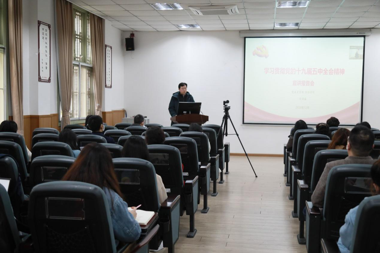 12月11日下午,我院召开政治学习会议暨全院大会,邀请学习贯彻党的十九届五中全会精神宣讲团专家、校宣传部部长徐海鑫深入宣讲党的十九届五中全会精神。会议由学院党委书记姜晓萍主持,按照学校新冠疫情防控安排,学院党政领导、党委委员、纪委委员、党支部书记、教职工代表在萃文楼105报告厅参加会议,其余教职工通过视频参加会议。