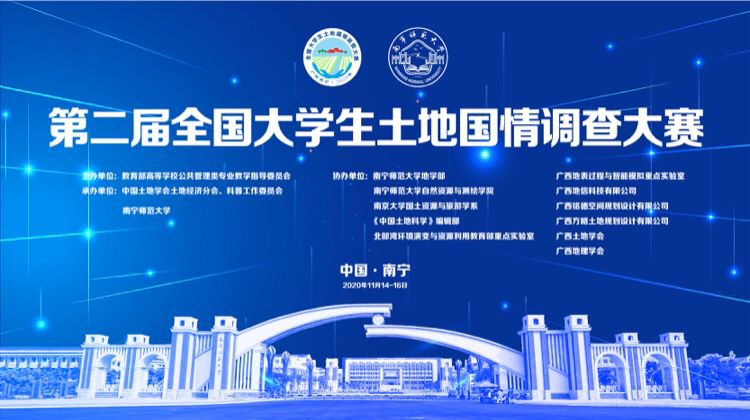 2020年11月15日,“第二届全国大学生土地国情调查大赛”决赛在南宁师范大学举办。该大赛由教育部高校公共管理类学科专业教学指导委员会主办,中国土地学会土地经济分会、科普工作委员会和南宁师范大学等单位承办。大赛主题为“土地政策创新与高质量发展”。