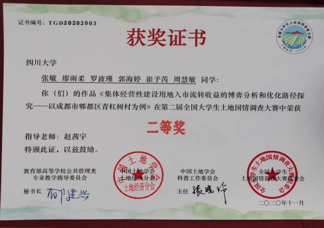 在土管系赵茜宇特聘副研究员的指导下,由我院土管系2018级本科生张敏、廖雨柔、罗波瑾、郭海婷、崔予芮、周慧敏组成的队伍,完成《集体经营性建设用地入市流转收益的博弈分析和优化路径探究——以成都市郫都区青杠树村为例》案例分析报告,经过激烈的竞争进入决赛,并通过现场汇报和答辩中的优异表现,获得“二等奖”的荣誉。