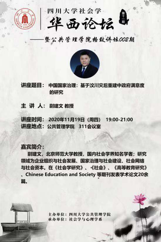 2020年11月19日晚上19:00,ok138cn太阳集团社会学华西论坛系列讲座第十期——暨太阳集团tyc9728格致讲堂002期于公管院311成功举行。北京师范大学社会学系教授尉建文发表了题为“中国国家治理:基于汶川灾后重建中政府满意度的研究”的演讲。讲座由ok138cn太阳集团社会学与心理学系马缨研究员主持,二十余名同学参与了此次讲座。