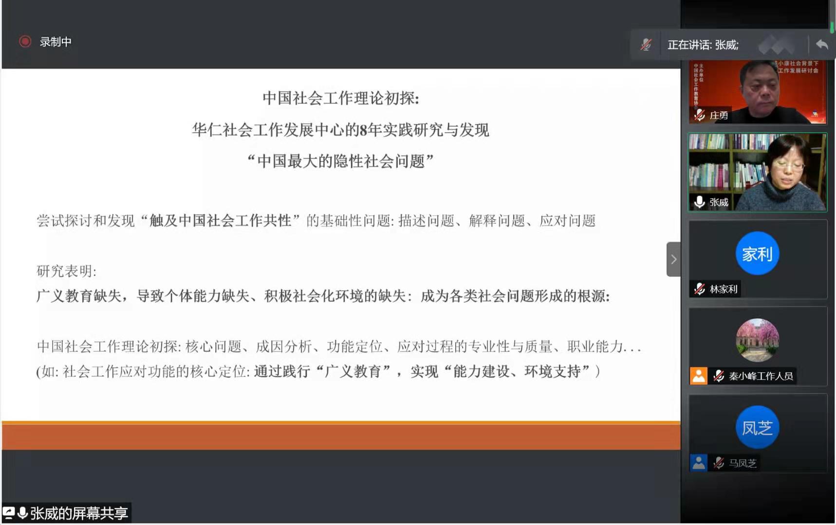 四,中国社会工作理论初探:华仁社会工作发展中心的8年实践研究与发现。张威教授对华仁社会工作发展中心“以社会教育学为基础的”实践工作进行了长达8年的研究,尝试探讨和发现“触及中国社会工作共性”的基础性问题。研究发现涉及“解释问题”和“应对问题”两个层面:第一,因“广义教育”缺失,导致“个体能力缺失以及积极社会化环境的缺失”,引发一系列个体问题和家庭问题,这些问题又进一步引发各种社会问题。因此广义教育的缺失,成为各类社会问题形成的根源。张威教授称之为“中国最大的隐性社会问题”。第二,通过践行广义教育,实现“能力建设、环境支持”两大核心目标。张威教授8年来的实践研究与发现,是对构建中国社会工作理论的初步探索。