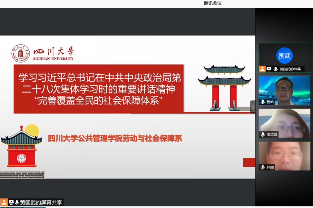 2021年4月21日,ok138cn太阳集团劳动与社会保障系召开了一次线上线下同步的座谈会,专题学习习近平总书记在中共中央政治局第二十八次集体学习时的重要讲话精神。劳动与社会保障系系主任蒲晓红教授主持会议,社保系罗哲、沙治慧、李丹、罗亚玲、黄国武、张伟科、曹杨等老师参加线下学习、张浩淼、林熙、杨帆等老师参加线上学习。大家认真学习习总书记讲话精神,并积极发言。