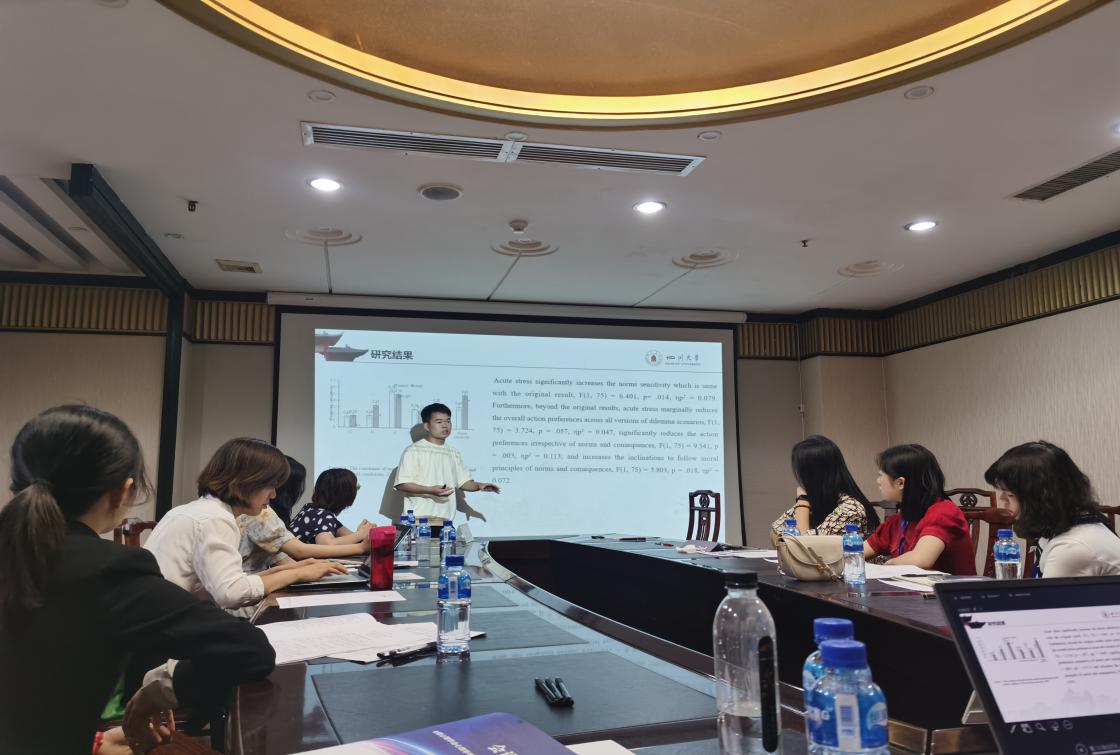 2020级应用心理硕士研究生吴俊红以“What is the relationship between stress and moral decision-making ? A data reanalysis exploration”为题分享了自己的最新研究,介绍了我院刘传军老师关于道德心理学领域的前沿研究范式“CAN”模型,并应用于具体研究中,得到多名专家学者的赞赏,并与来自华中师范大学、南京师范大学的同学们进行了深入的学术分享与交流。
