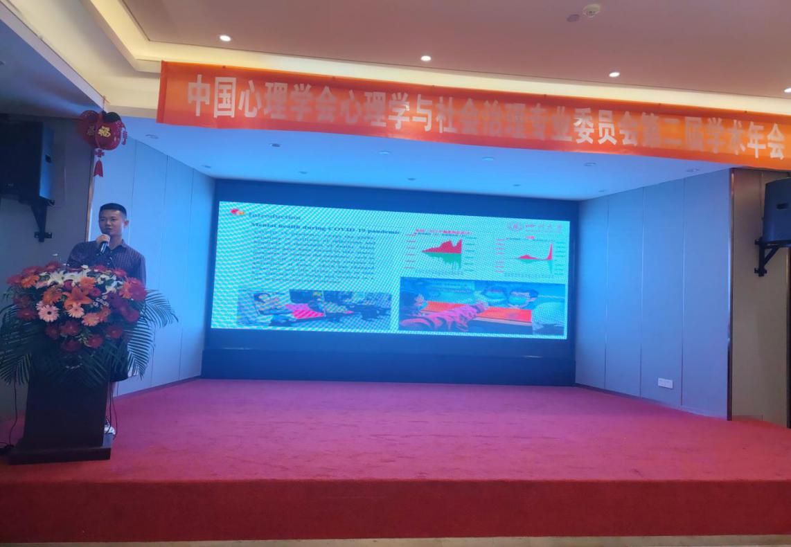 会上,徐文健特聘副研究员以“新冠疫情背景下社会心理研究”为主题组建了专题报告并担任主持人。在题为“新冠疫情期间手机过度使用增加心理健康风险:失眠症的中介作用”的报告中,徐文健老师系统分析了新冠疫情期间居家隔离居民精神障碍问题的发生率,并就疫情期间手机使用时长对心理健康的影响机制及失眠症在其中的作用进行了深入探讨,最后也指出了关于心理干预预防心理健康问题的有效途径。2021级准硕士研究生薛爽也在徐文健老师指导下以“新冠疫情期间心理弹性对大学生亲社会行为的影响:社会支持的中介和调节作用”为题做了报告。