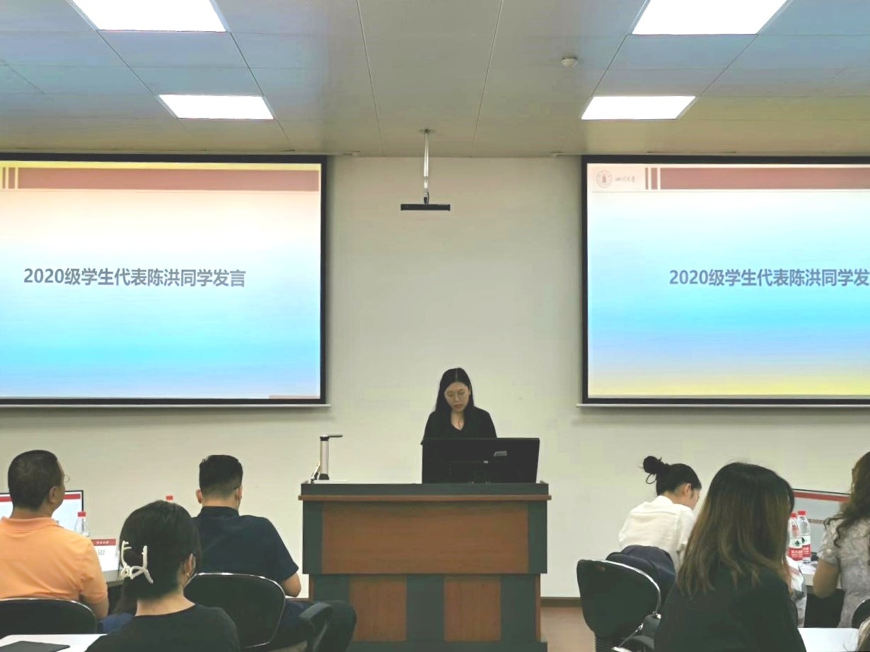 2020级在校学生代表陈洪从自身求学经历出发,分享自己在川大读研期间的学习、生活的经验与乐趣,建议新同学们找准目标与方向,勇于直面失败并珍惜专业实践机会,并勉励下一届学弟学妹继往开来。