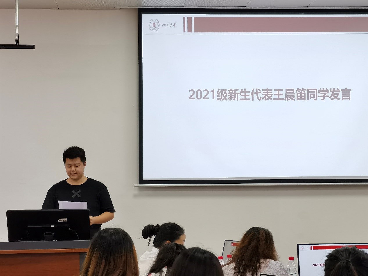 2021级新生代表王晨笛同学作为新生代表回顾了自己考研期间的心得和对图书情报这一专业的理解,同时也表达了在接下来的两年求学时光里对川大的期待。
