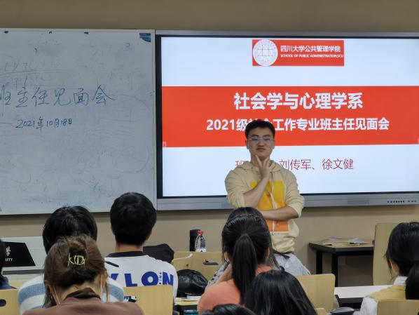 为了帮助同学们更好地了解社会学与心理学系全体教师的教学科研情况,促进专业教师与学生之间的交流互动,助力学业发展,2021级社会工作专业于10月19日晚在江安校区第一教学楼D506顺利开展了班主任见面会。会议由徐文健、刘传军两位班主任老师主持,2021级社会工作专业全班同学参加。