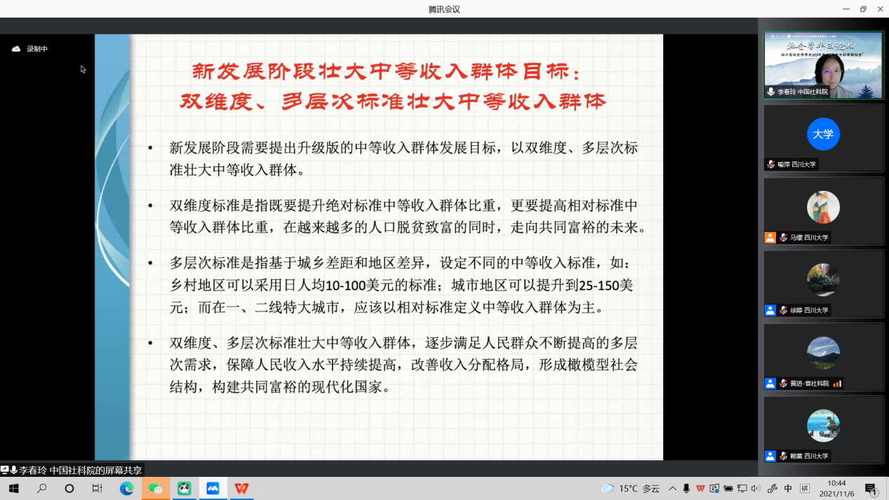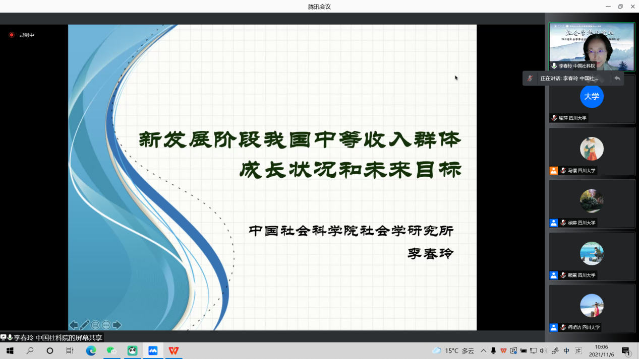 2021年四川省社会学年会于11月6日在ok138cn太阳集团召开,此次会议采取线上的方式举行,有近200人参与了此次年会。中国社会科学院社会学研究所研究员、博士生导师、青少年与社会问题研究室主任李春玲在大会上围绕“新发展阶段我国中等收入群体成长状况和未来目标”做了主题发言。