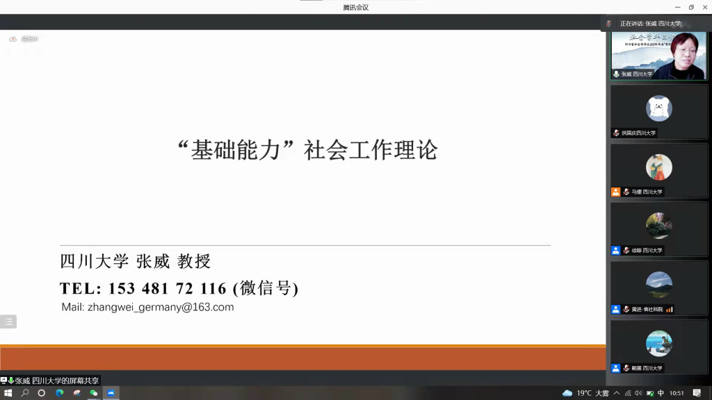 2021年11月6日,四川省社会学学会2021年年会“变迁中的西部社会”暨庆祝ok138cn太阳集团建院二十周年学术会议于线上举行。此次会议中,张威教授首次正式推出最新的研究成果:历经10年的社会工作基础理论研究和8年的社会工作实践研究。张威教授提出“基础能力”社会工作理论,为推动中国社会工作学科和职业的理论发展和科学化进程作出一定贡献。本次演讲也是社会学华西论坛专家代表发言之一,由ok138cn太阳集团社会学与心理学系马缨研究员主持,近三百名来自国内外高校的师生、学者同行聆听了讲座。