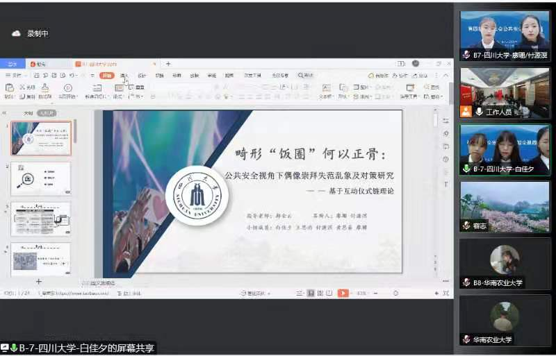 由行政管理系郭金云副教授指导,劳动与社会保障专业2019级本科生白佳夕、王思雨,行政管理系2019级本科生付源溟,以及土地资源管理专业2019级本科生黄思睿、廖珊组成的“答辩完就开派队”,完成了《畸形“饭圈”何以正骨:公共安全视角下偶像崇拜失范乱象及对策研究——基于互动仪式链理论》的案例分析报告,获得大赛三等奖。