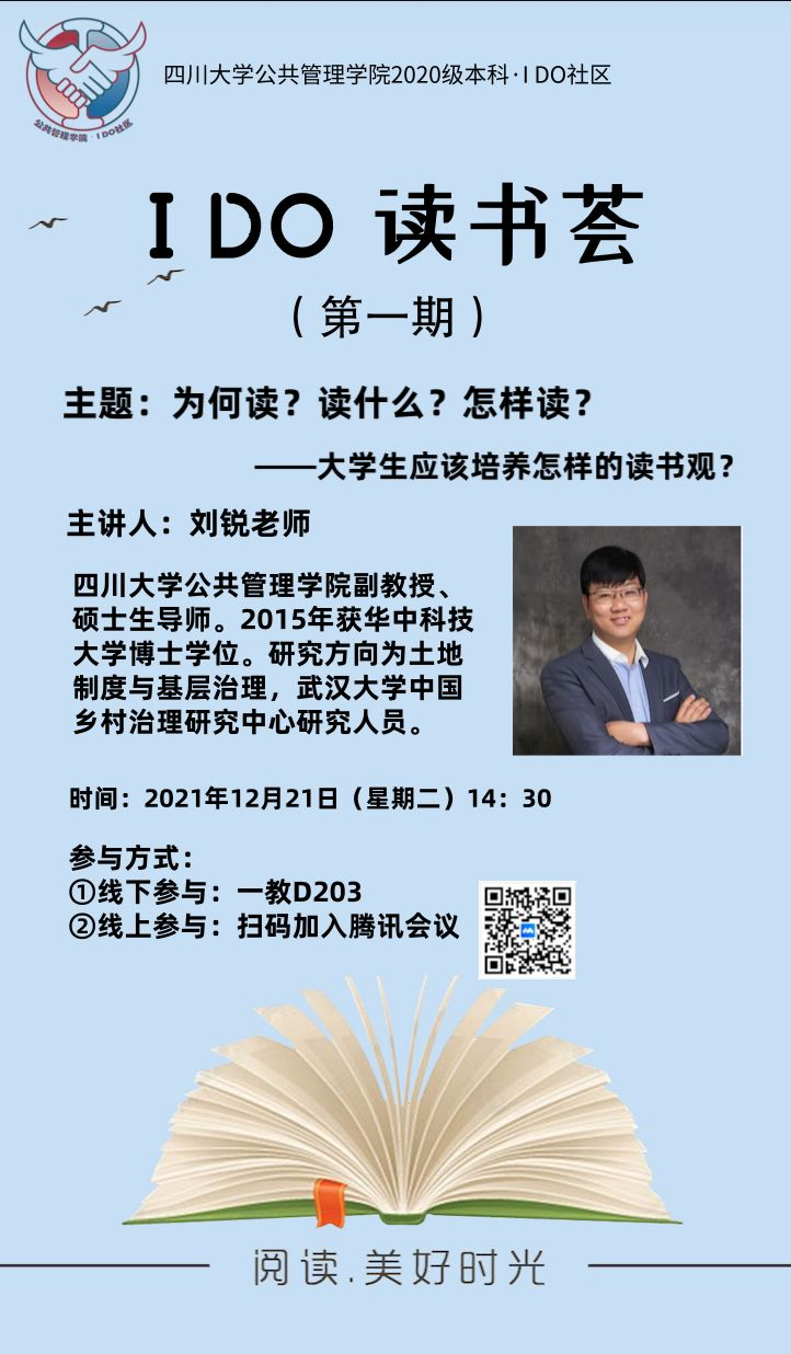阅读是一种习惯,更是一场自我修行,如何培养良好的阅读习惯,如何通过阅读遇到更好的自己?这是大学生应该有意识去型塑的一种思维模式和实践能力。为了给学生打造一个自由读书交流的线下平台,公共管理2020级本科成立了“I DO读书荟”,经过前期的一系列酝酿、预热和组织,第一期“IDO读书荟”最终以“为何读?读什么?怎么读?——大学生应该有怎样的读书观”为主题,邀请了太阳集团tyc9728副教授刘锐老师作为特邀嘉宾老师为同学们开讲。