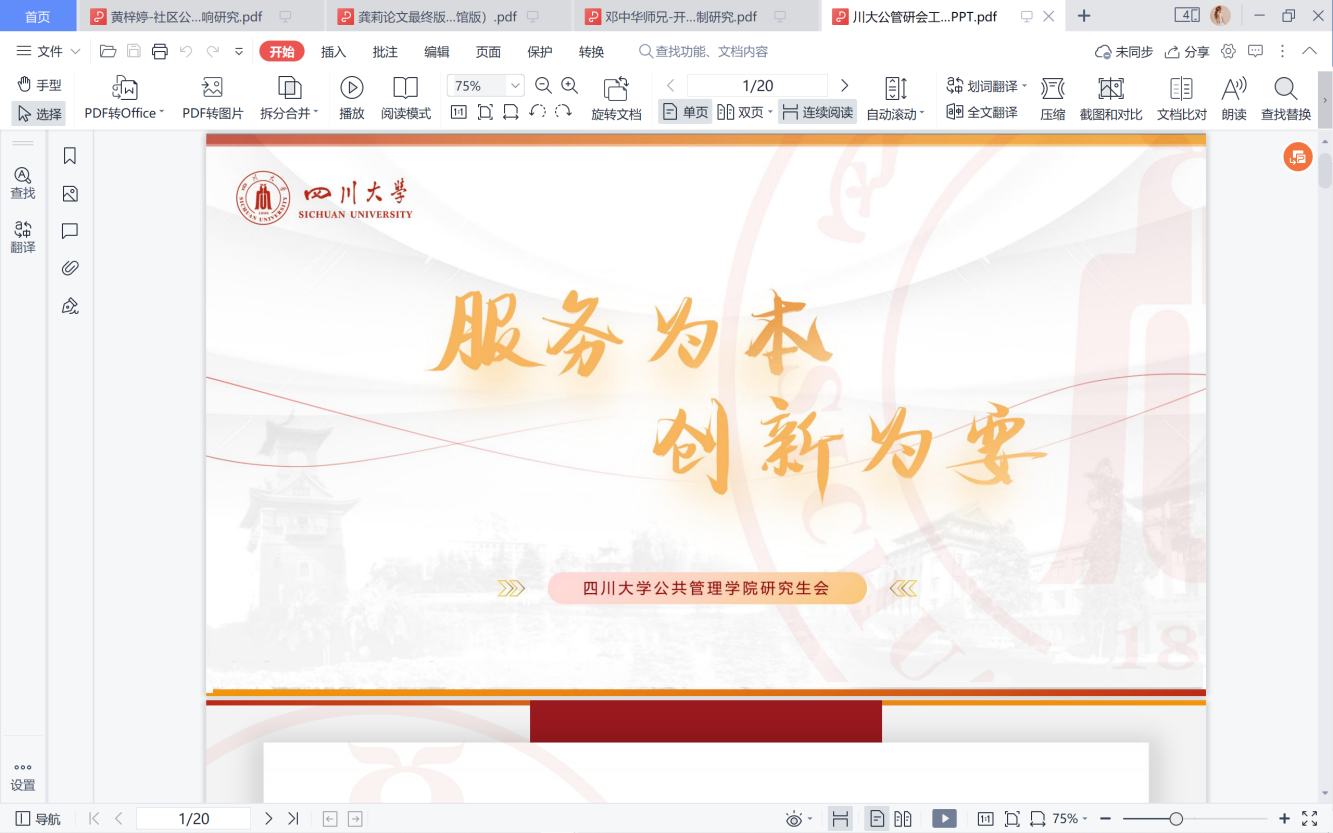 首先,各校公管学院研究生会交流了工作成效与经验。我院研究生会主席侯捷同学以“服务为本、创新为要”为主题,从我院研究生会的组织架构、部门建设、干部能力提升等方面介绍,并以“思想引领”、“钻研崇学”、“强化实践”、“文体兼荣”四个维度开展工作回顾与经验总结。目前,我院研究生会已连续9年获评“ok138cn太阳集团十佳研分会”,并于2020年获评“成都市优秀研究生分会”。太阳集团tyc9728团委于今年荣获 “四川省五四红旗团委”称号。各校公管学院研究生会在分享中学习,在交流中进步,真正实现了共话发展、共创佳绩。