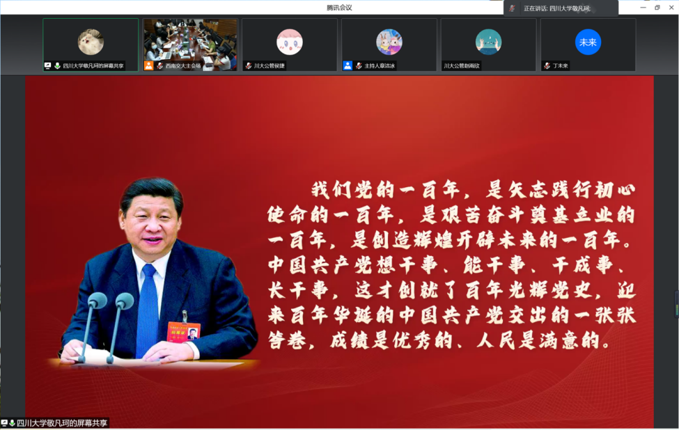 随后,各校研究生干部代表作主旨宣讲。我院研究生会副主席敬凡珂同学以“以百年党史悟卓越青年模样”为主旨,呼吁当代青年从厚重的党史、团史内涵中汲取丰富营养,掌握真才实学,增益其所不能,并在思想规划和行动作为上改变自己,真正做到爱国见于行动、立场融于人民、成长立于学习,把自身梦想立足时代,努力成为可堪大用、能担重任的栋梁之材。其他三所高校研究生代表将党史、团史与自身校史、院史相结合,分享了历史长河中的光荣历程,展现了新时代背景下高校研究生应有的担当精神和思想意识。