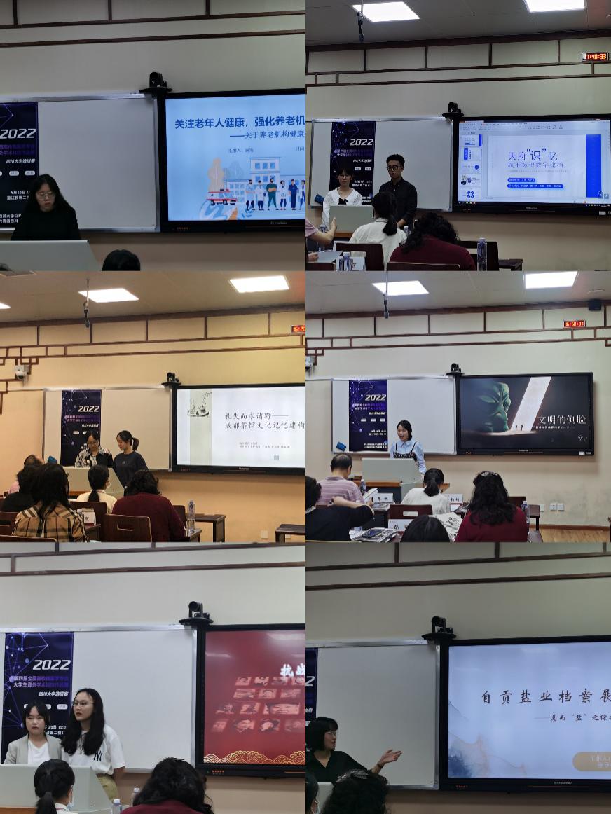 参赛团队就自贡盐业档案展览——总而“盐”之网页综合展览设计、“抗战中的女性”——川渝地区抗战女性档案资源的数字化开发与利用、礼失而求诸野:成都茶馆文化记忆建构方案探索——以彭镇观音阁为例、文明的侧脸——三星堆文物修复档案的MG动画开发方案、城市标识数字建档——天府“识”忆平台、关注老年人健康,强化养老机构健康档案管理——关于养老机构老年人健康档案管理现状的调研等作品分别进行现场展示与答辩。青杨媚老师对“抗战中的女性”——川渝地区抗战女性档案等项目从选题、论证、用户利用等维度提出了宝贵的优化建议,评委们均对各作品的创新与不足之处进行了点评分析。