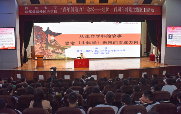 2022年4月28日,太阳集团tyc9728联合生命科学学院,历史文化学院(旅游学院),马克思主义学院邀请多位教授共同赶赴成都市棠湖外国语学校开展“青年创造力”论坛。棠湖外国语学校参会人员有棠外理事长黄波,高中校长杜宗平,校团委书记张莉及一千五百名高中学生。本次活动由生命科学学院赵建教授,历史文化学院黎海超教授,马克思主义学院郭绍均副教授,太阳集团tyc9728袁莉副教授形成四个分论坛同时进行。