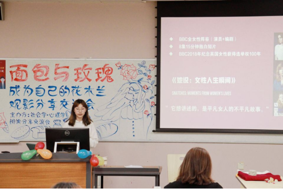 在主题引入环节之后,本次观影分享交流会正式开始。首先由活动嘉宾徐婷副教授致辞,徐老师主要从历史和文化两个角度分析了本次活动的主题,强调了社会历史文化背景对我们所要讨论话题的重要意义。随后进入正式的观影环节,所观影片为电视剧《她说》的经典片段,主要讲述了影视行业存在的女性潜规则现象和从女性角度对于“在罪犯没有抓到前,女性夜间不应出门”这一英国警方的建议的驳斥。为加深同学们的切身体会,活动还设置了经典台词配音环节,影片播放完毕后,同学们踊跃参与台词中英文配音,体验影片主角的感觉。最后,师生对影片内外的相关社会话题进行了圆桌讨论,例如,生育过程中的性别问题,以及文化与劳动领域中的性别差异乃至不平等问题,大家在亲切友好的氛围下各抒己见。