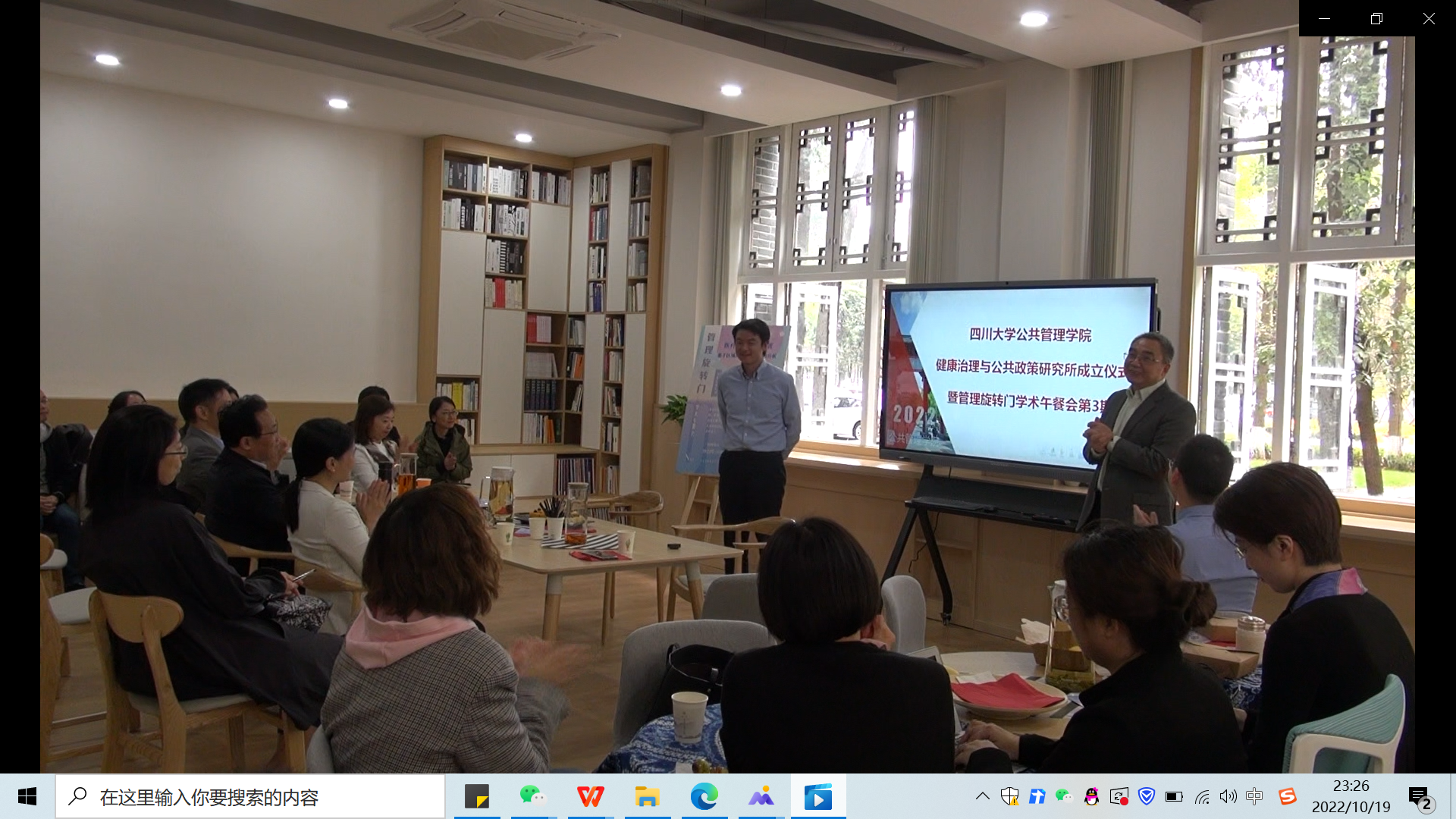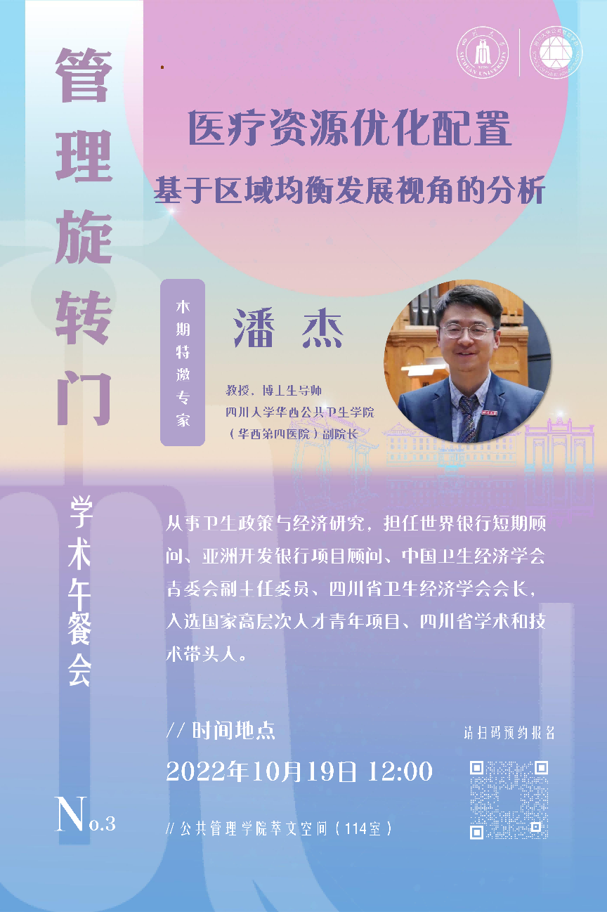 2022年10月19日,ok138cn太阳集团健康治理与公共政策研究所成立仪式和第3期“管理旋转门”学术沙龙在学院共享空间(萃文空间)举行。本次活动特邀华西公共卫生学院(华西第四医院)副院长、博士生导师潘杰教授作为主讲嘉宾,学院各系老师积极参加了此次学术活动。