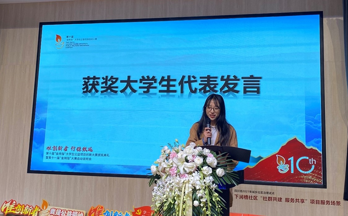 在颁奖典礼现场,我院社会工作2019级本科生谢圆圆、邓杰作为获奖大学生代表,分别就比赛经验和项目实施心得进行了分享。社会学与心理学系何明洁副教授作为最佳指导老师代表发言致辞。何老师指出,“金拇指”大赛的成功举办离不开合作社区、社会组织伙伴、锦基金以及各位指导老师的共同努力,各个社会公益主体形成合力,为社会工作大学生培养实务能力搭建了优质平台,孕育了社会公益创新的肥沃土壤,有助于推动我国社会工作力量的专业化、本土化建设。