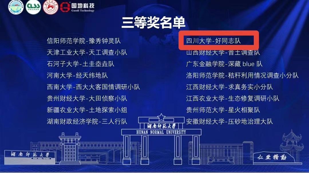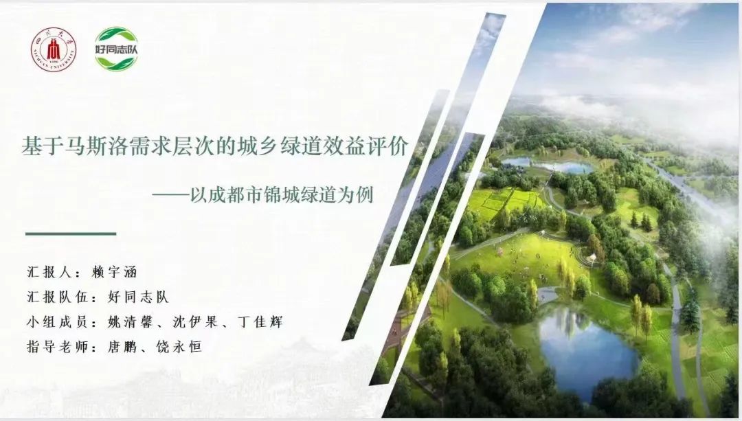 由我院土地资源管理专业2020级本科生赖宇涵、丁佳辉、沈伊果、姚清馨组成的好同志队探索城乡绿道工程的综合效益评价,为城乡绿道工程的未来发展和“公园城市”理念的深入推进提供理论支撑,凭借《基于马斯洛需求层次理论的城乡绿道效益评价——以成都市锦城绿道评价为例》调查报告,荣获“三等奖”。