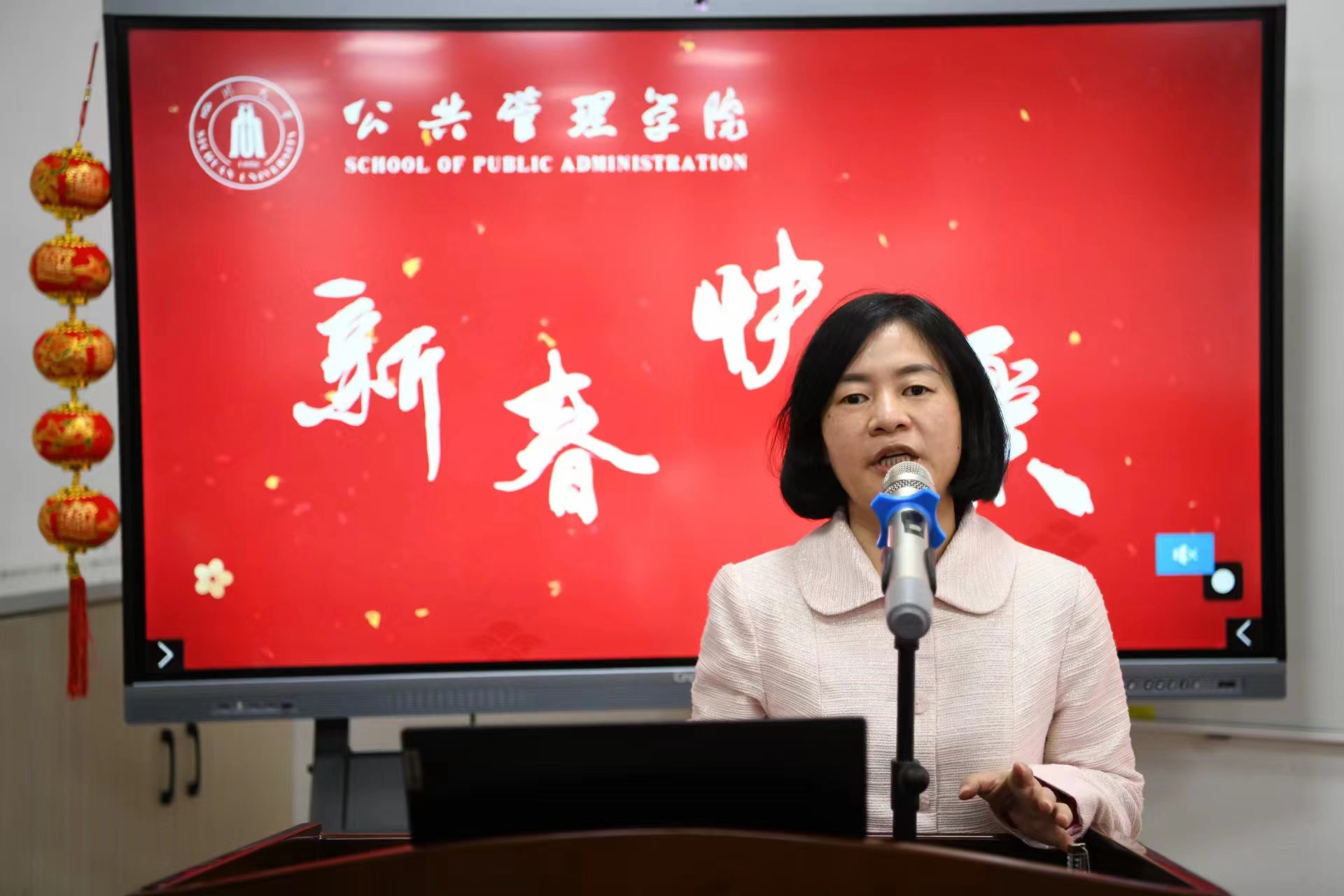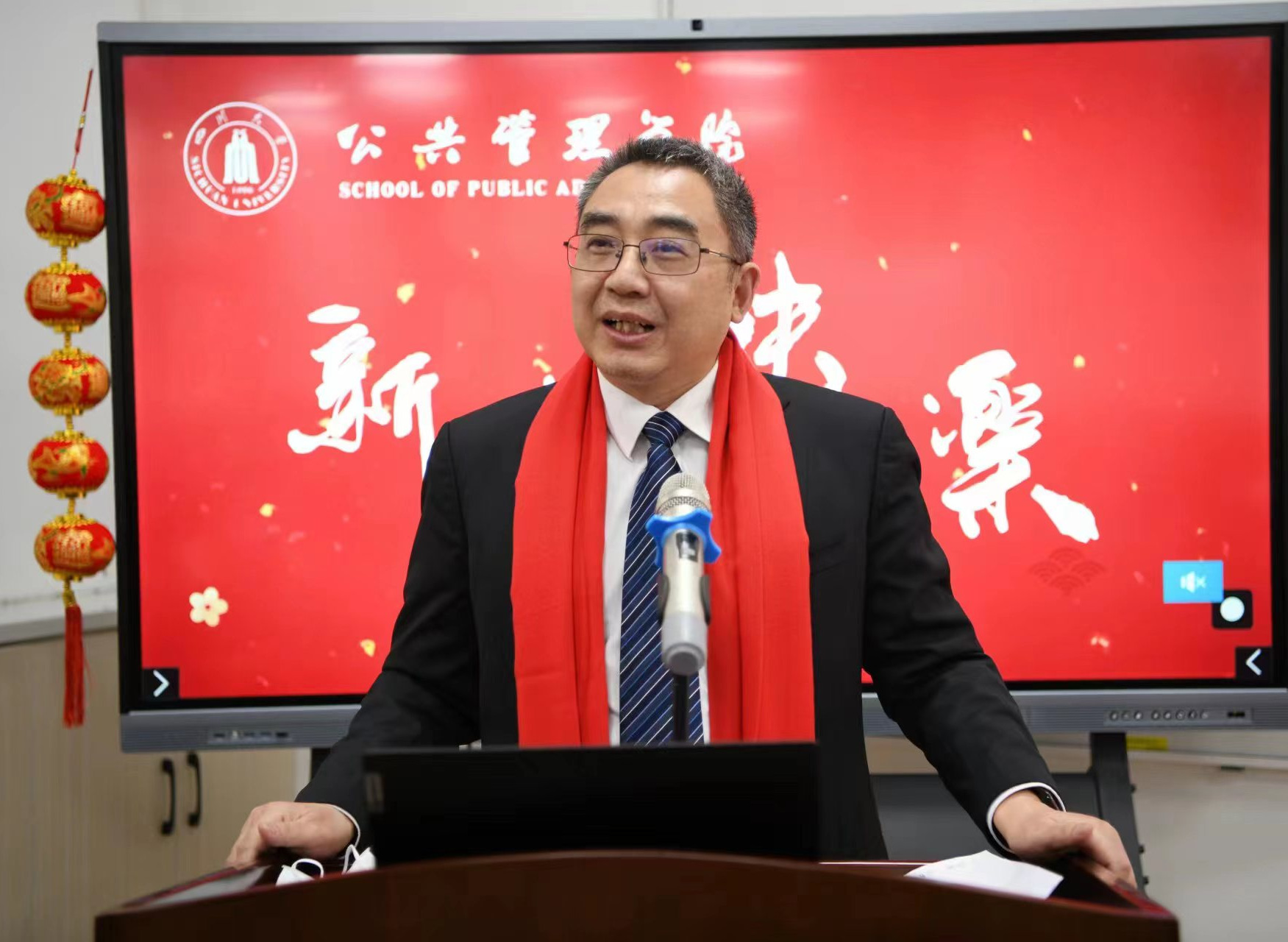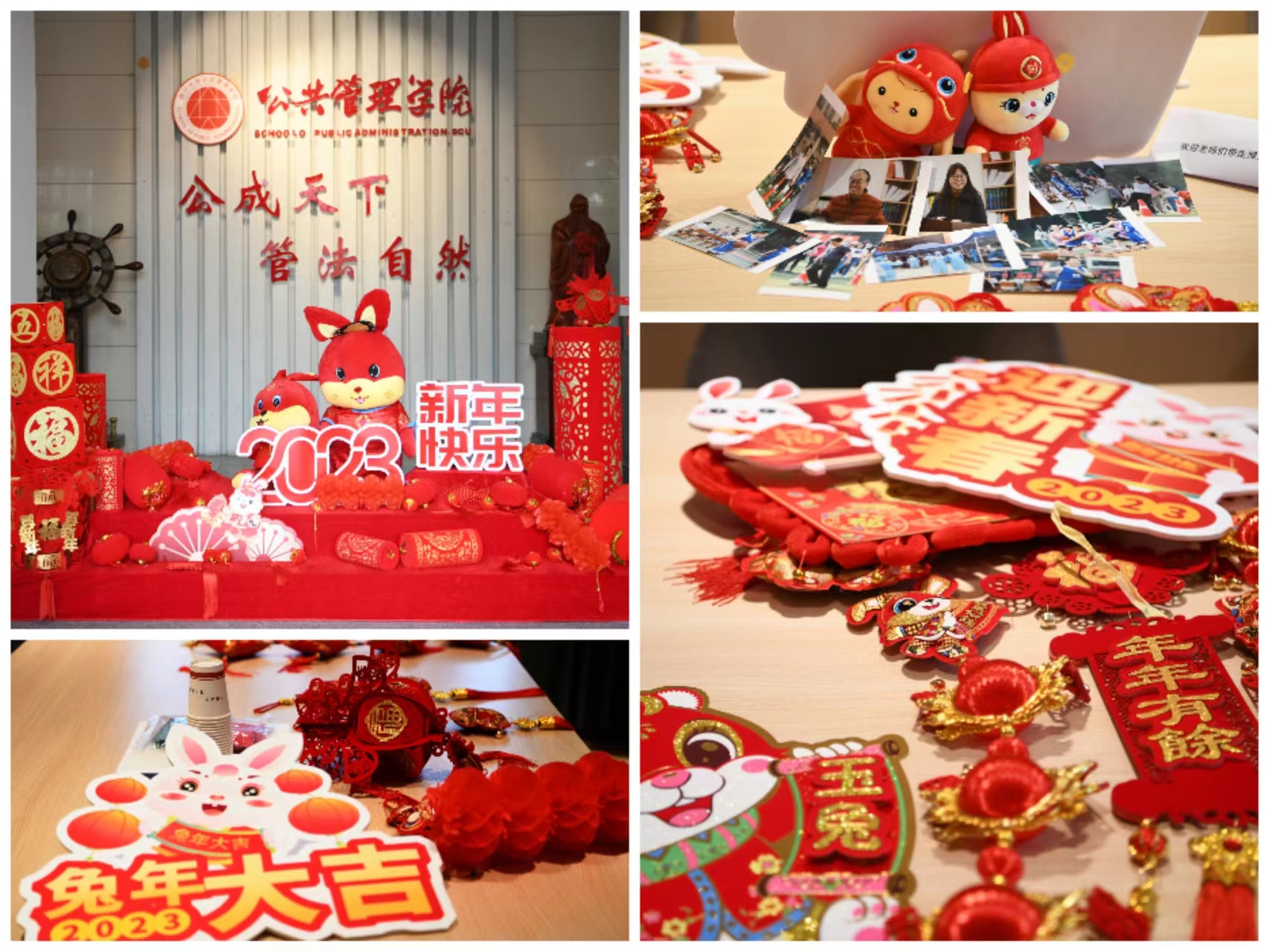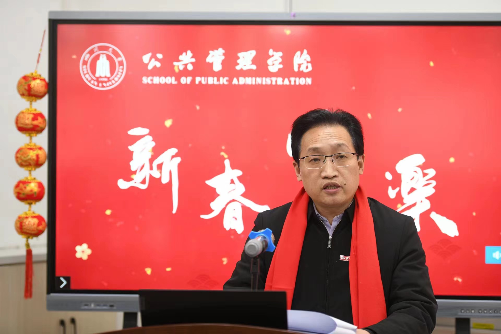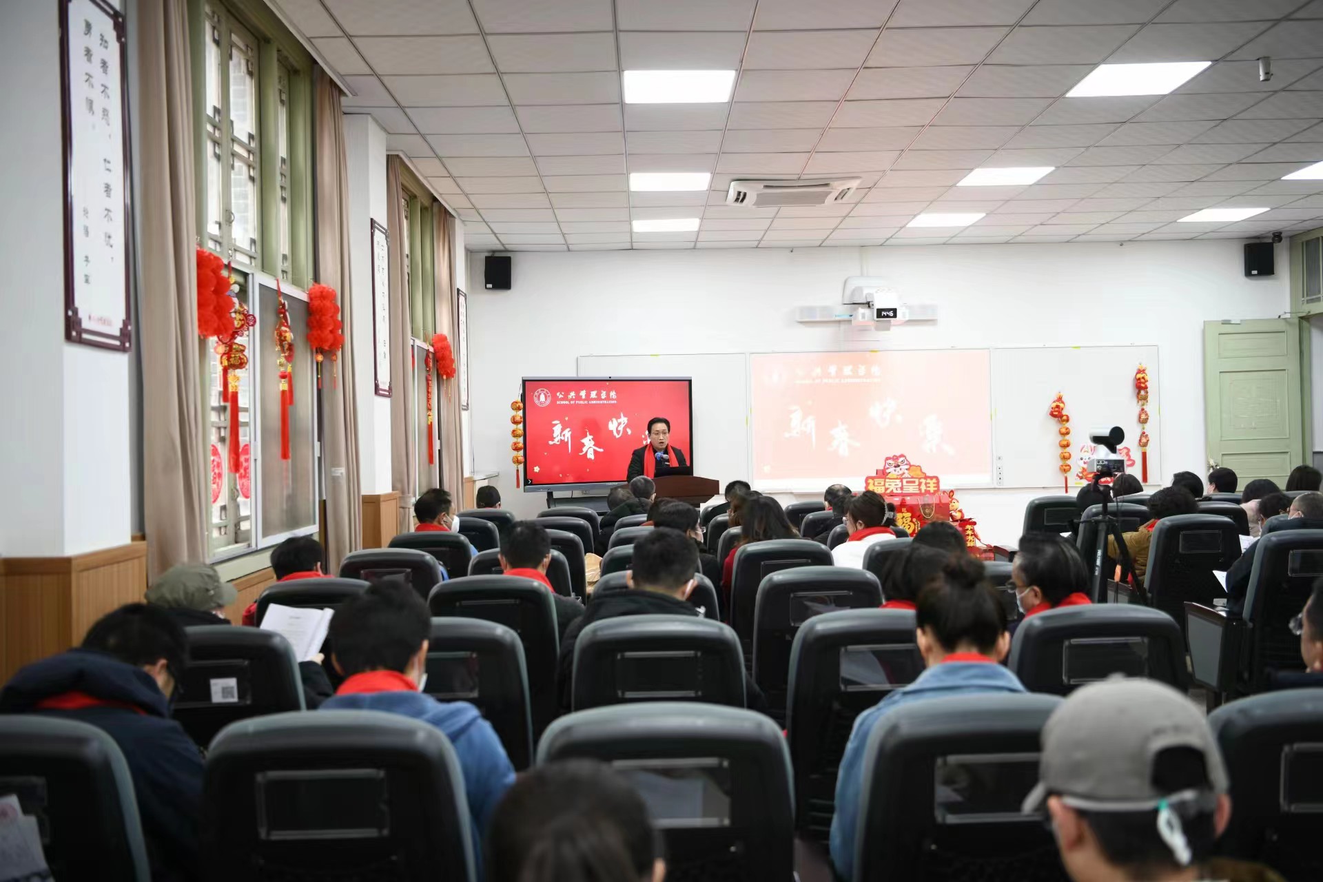 学院工会为教职工精心搭建了新春祝福主题场景,准备了红围巾、中国结、对联、主题KT板等活动物品,学院领导班子和教职工为全院师生、全球院友和社会各界朋友送上新年祝福。2022年工作交流总结会暨新春贺喜活动在浓浓的新年喜庆氛围中圆满结束。