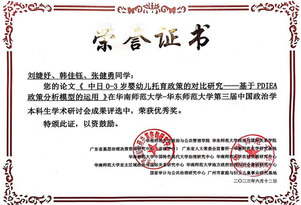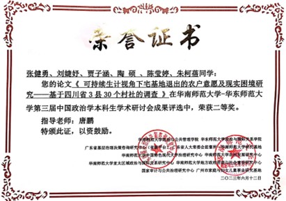 6月9日—6月11日,“第三届中国政治学本科生学术研讨会”在华南师范大学召开。我院2020级土地资源管理本科生张健勇同学撰写的论文《可持续生计视角下宅基地退出的农户意愿及现实困境研究——基于四川省3县30个村社的调查》获得二等奖,2020级土地资源管理本科生刘婕妤同学撰写的论文《中日0-3岁婴幼儿托育政策的对比研究——基于PDIEA政策分析模型的运用》获得优秀奖。