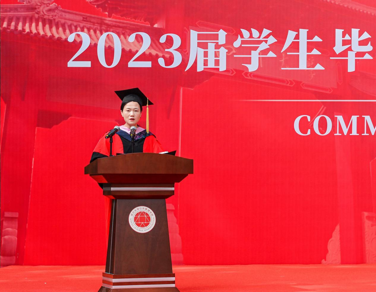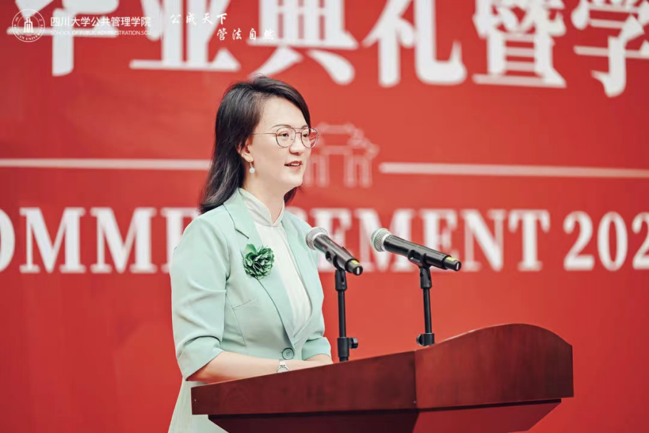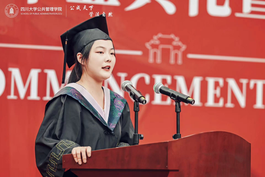 学生代表2023届本科毕业生赵雨婷在发言中回忆了和川大公管相遇的四载光阴,感怀在老师们培育下砥砺成长的四年时光,感谢生逢与祖国同向同行的时代。表达了在风险场景中不断提升能力和素养的决心,表达了离别之际对学院、老师和同学的祝福。