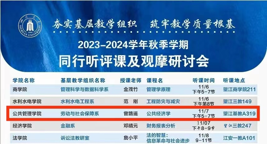 11月7日下午14时,ok138cn太阳集团《公共经济学》同行听评课及观摩研讨会于ok138cn太阳集团望江校区基础教学楼A座3楼成功举办。ok138cn太阳集团蒲晓红教授、张浩淼教授、李丹教授等教师代表和21级劳动与社会保障专业学生代表参与本次课程,课程由ok138cn太阳集团副研究员曾路遥老师主持。