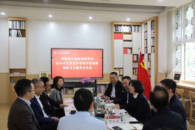 韩杰书记对市政府研究室一行来我院调研表示热烈欢迎,表示学院将发挥学科优势和特点,积极服务地方经济社会发展。随后,学院院长夏志强教授回顾了我院建院20多年来深度参与成都市多项重大改革发展的历程,并表示将以此为契机,延续优良传统,围绕共同关注的话题,深度挖掘合作潜力,推动学院发展与成都市城市发展共生共荣。