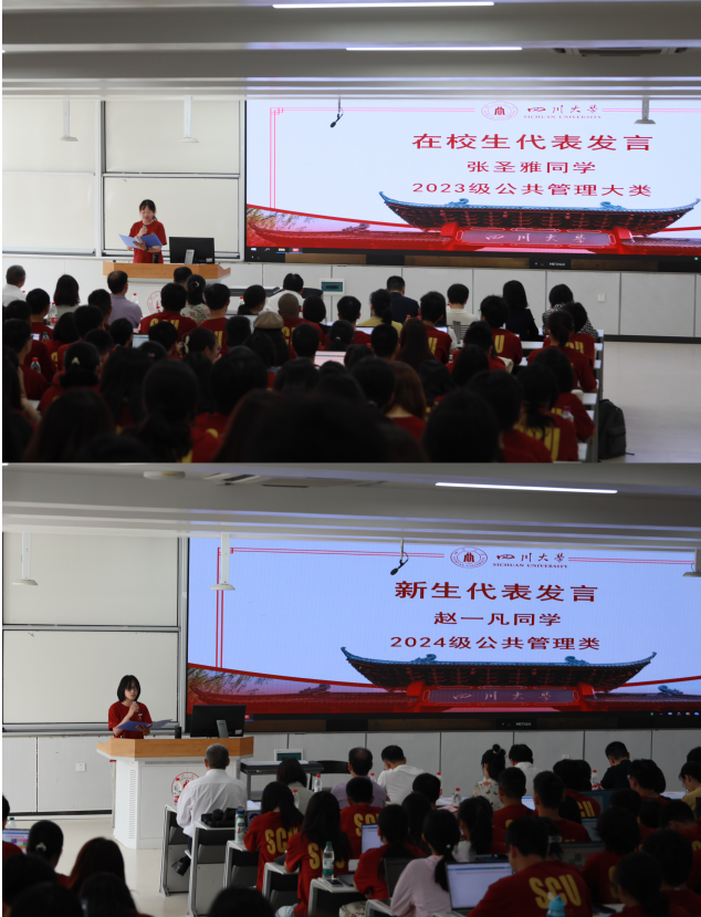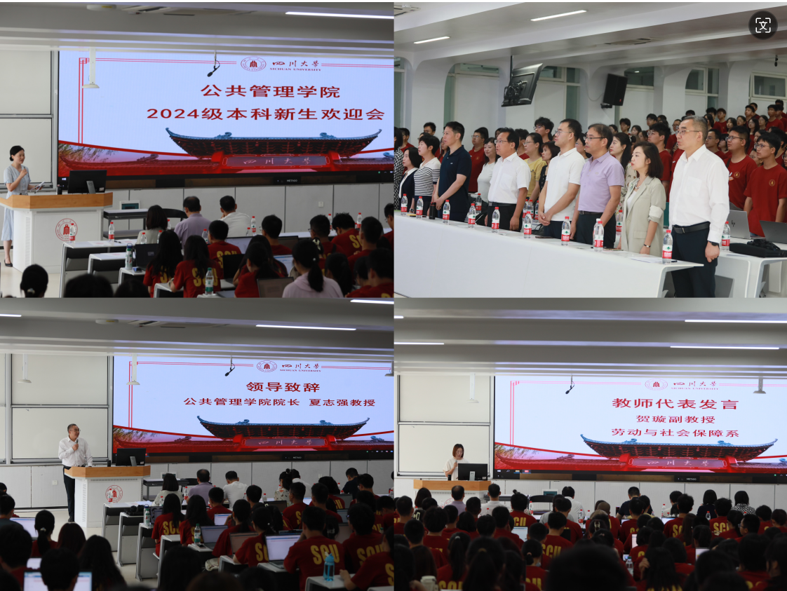 夏志强院长表达了对新同学们的热烈欢迎,并从中国式现代化治理和全球治理两个切入点,向同学们揭示了“公共管理”的深刻内涵,对同学们提出殷切期望,希望同学们成长为活跃在国际舞台的川大公管人。