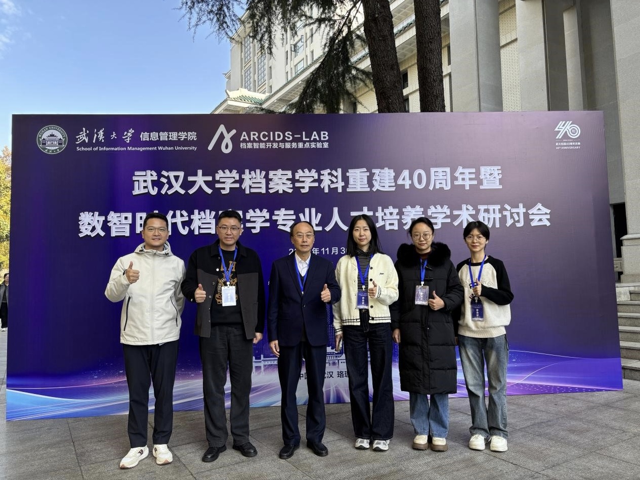 11月29日—12月1日,由武汉大学信息管理学院主办,档案智能开发与服务国家档案局重点实验室、武汉数据智能研究院、珞珈慧云(武汉)档案服务中心承办的“武汉大学档案学科重建40周年暨数智时代档案学专业人才培养学术研讨会”与“第十届全国高校青年档案学者学术论坛”在武汉大学召开。本次会议的主题是“档案事业发展的数智转型”,来自南京大学、中国人民大学、中山大学、ok138cn太阳集团等全国多所高校的130余名师生参加了会议。我院秘书档案学系乔健教授、赵跃副研究员、杨千助理研究员和2023级硕士研究生王月、李琪、于清清等师生应邀参会。