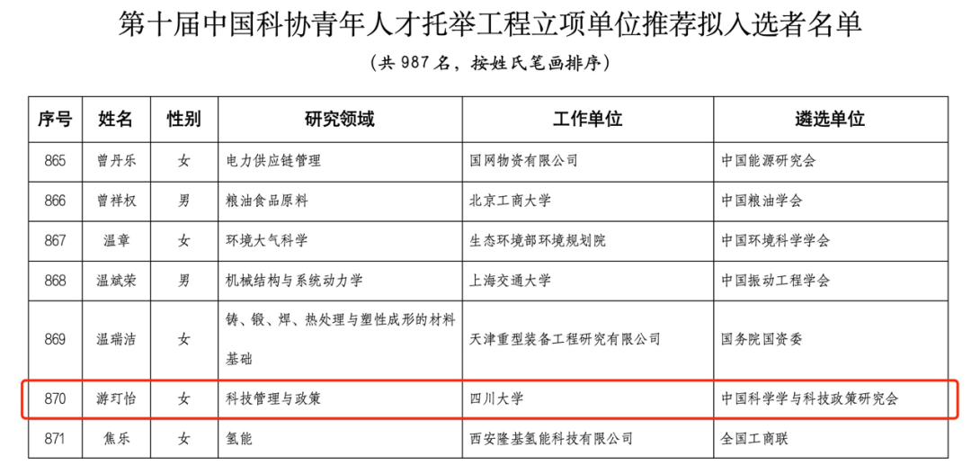 2月26日—3月4日,中国科学技术协会对第十届中国科协青年人才托举工程人选名单进行公示,共遴选出第十届中国科协青年人才托举工程人选987名。我院青年教师游玎怡特聘副研究员入选。