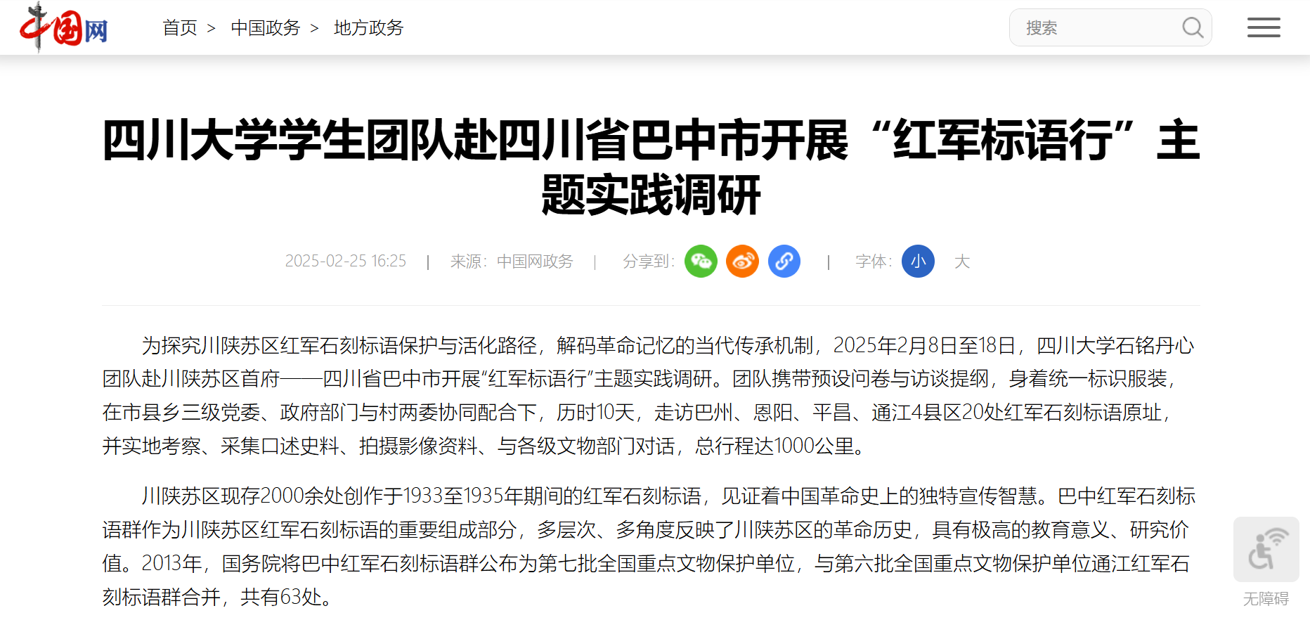 2022级社会工作专业本科生苟鑫带领的ok138cn太阳集团石铭丹心团队赴川陕苏区首府——四川省巴中市开展“红军标语行”主题实践调研。该团队在市县乡三级党委、政府部门与村两委协同配合下,走访了巴州、恩阳、平昌、通江等4县区20处红军石刻标语原址和2处标语陈列馆,通过实地走访、口述史采集、影像收集和与各级文物部门的对话,团队成员认识到红军石刻标语的独特价值,也为下一步探索革命老区红色文化传承、保护与开发路径奠定了良好基础。