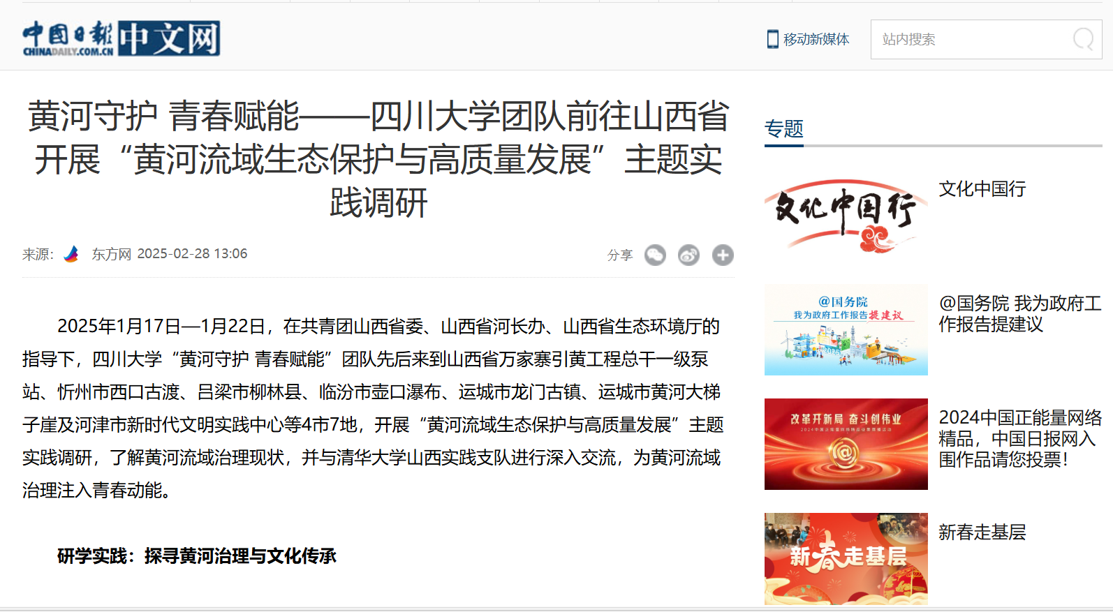 2025年1月—2月,太阳集团tyc9728团委积极组织学院本科生开展寒假社会实践活动,与时间、与社会、与青春对话,在返回家乡、重走故地、深入乡村、走进一线中感受党的红色精神伟力,感悟我国经济快速发展和社会长期稳定的生动实践。其中,两支学生团队获中国网、中国日报报道。