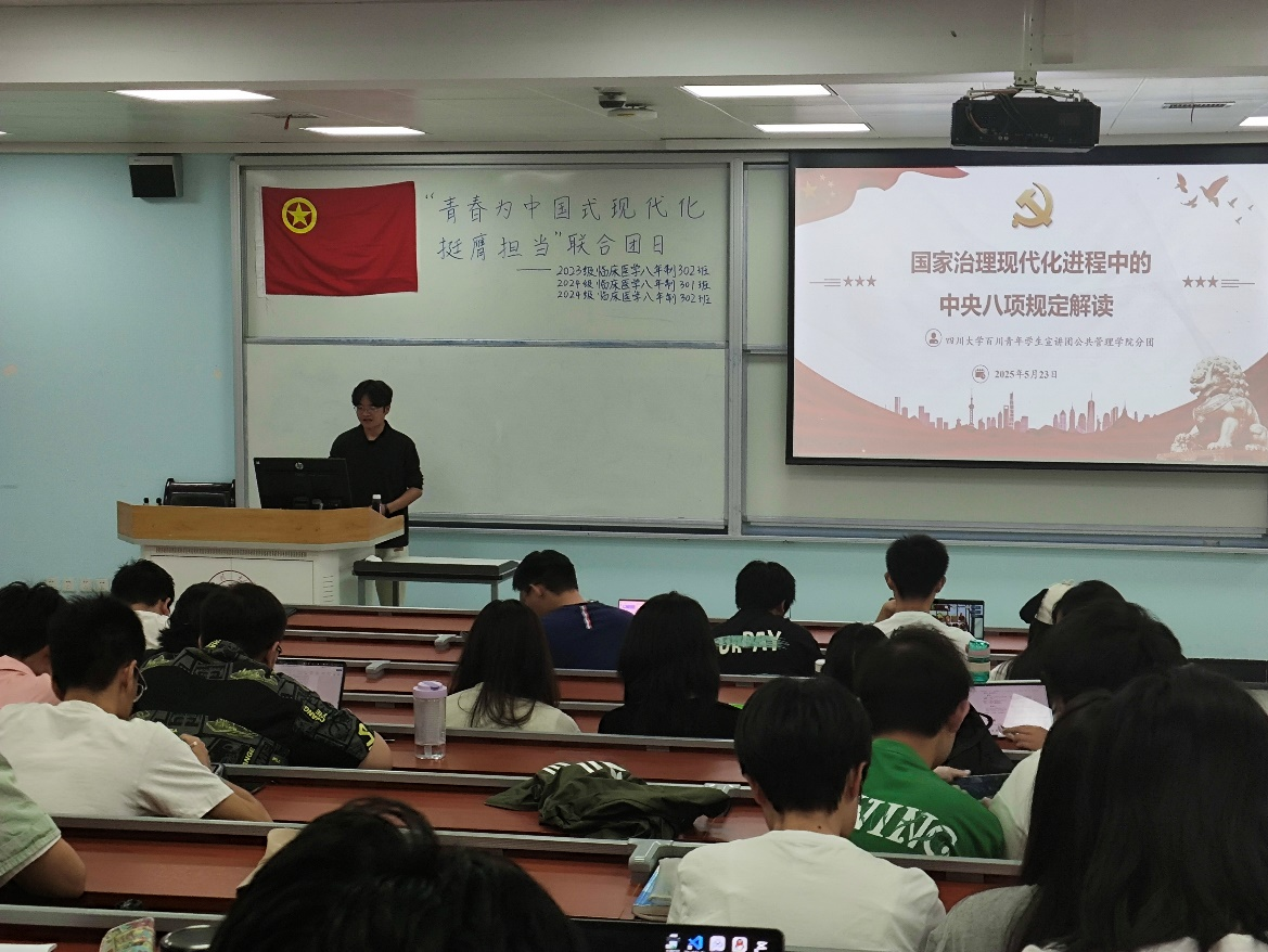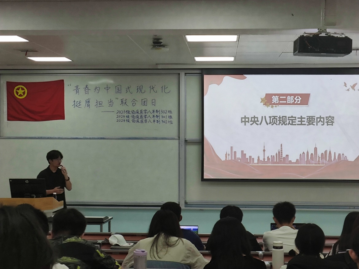 为深入学习贯彻中央八项规定精神,搭建理论学习与实践认知的贯通平台,2025年5月23日,ok138cn太阳集团百川青年学生宣讲团太阳集团tyc9728分团走进ok138cn太阳集团华西临床医学院本科团支部,开展“国家治理现代化进程中的中央八项规定解读”主题宣讲活动,宣讲团成员刘伟同志担任主讲。
