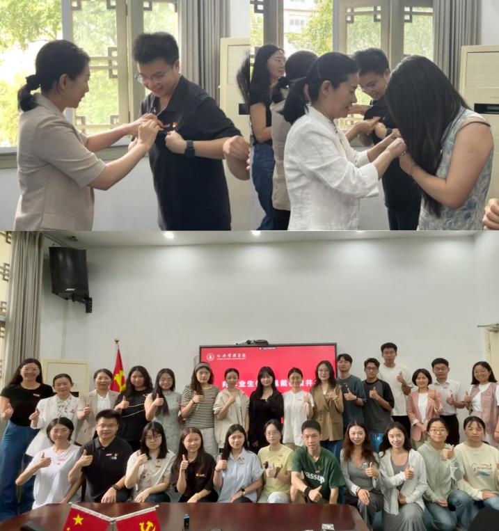 会后,举行了为毕业生代表佩戴校徽的仪式。一枚小小的校徽承载着学院对毕业生的深切期许与美好祝愿,这是一场深情的“告别礼”,也是关于“身份、传承与守望”的庄重宣告。