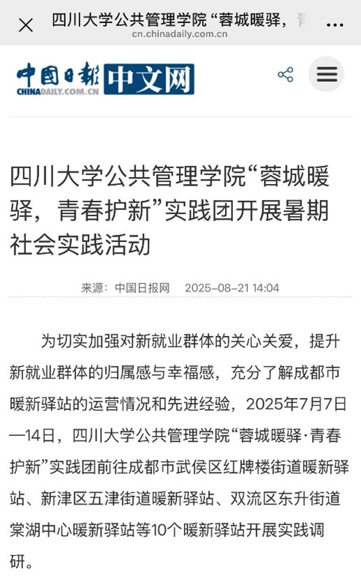 为深入学习贯彻习近平新时代中国特色社会主义思想,落实党的二十大精神、二十届三中全会精神和中央城市工作会议精神,深刻领会习近平总书记关于新就业群体的重要讲话重要指示精神,切实加强对新就业群体的关心关爱,提升新就业群体的归属感与幸福感,充分了解成都市暖新驿站的运营情况和先进经验,2025年7月7日—14日,ok138cn太阳集团“蓉城暖驿·青春护新”实践团前往成都市武侯区红牌楼街道暖新驿站、新津区五津街道暖新驿站、双流区东升街道棠湖中心暖新驿站等10个暖新驿站开展实践调研。