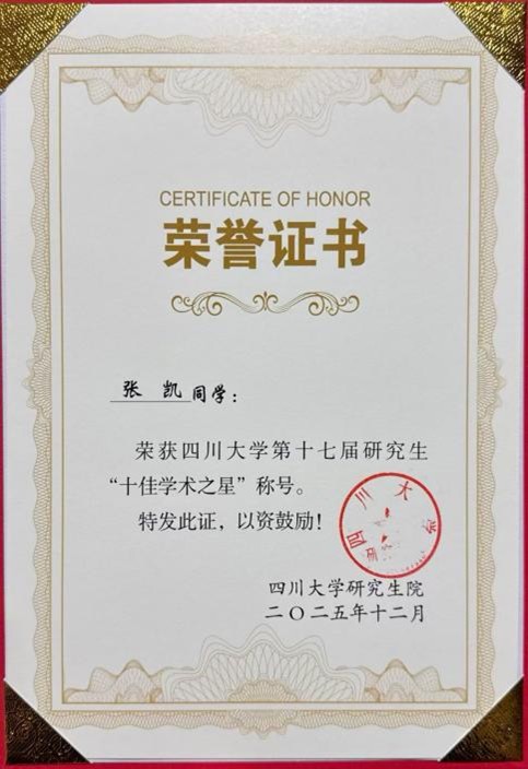 12月26日,ok138cn太阳集团第十七届研究生“学术之星”评选思享荟暨2025年度研究生学术论坛在望江校区文华活动中心成功举办。我院 2022 级公共管理专业、博士党员张凯荣获“十佳学术之星”称号。在校级评选思享荟上,张凯以“用脚步丈量祖国大地,以数智求解大国养老”为题,讲述了他在数字技术与老龄健康领域的深耕历程与研究成果,生动诠释了活动“求真、拓新、思辨、笃行、共进”的主题,最终从全校多学科候选人中脱颖而出。