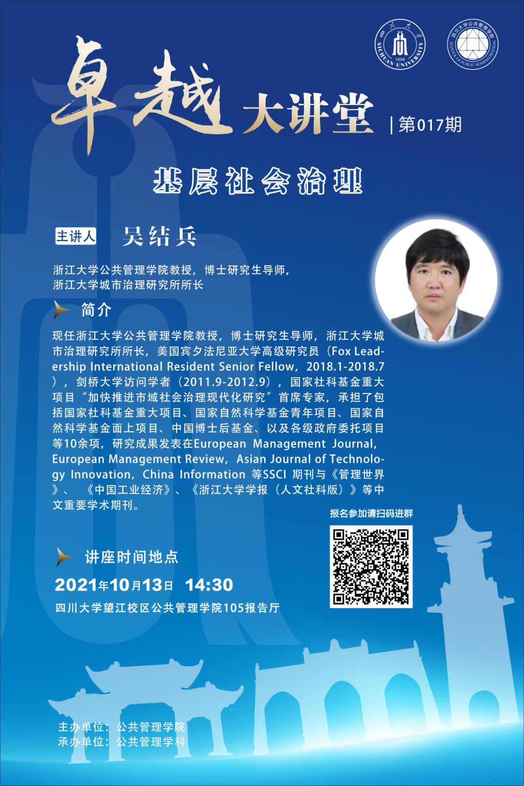 吴结兵,浙江大学太阳集团tyc9728教授,博士研究生导师,浙江大学城市治理研究所所长,美国宾夕法尼亚大学高级研究员(Fox Leadership International Resident Senior Fellow,2018.1-2018.7),剑桥大学访问学者(2011.9-2012.9),国家社科基金重大项目“加快推进市域社会治理现代化研究”首席专家,承担了包括国家社科基金重大项目、国家自然科学基金青年项目、国家自然科学基金面上项目、中国博士后基金、以及各级政府委托项目等10余项,研究成果发表在European Management Journal,European Management Review,Asian Journal of Technology Innovation,China Information 等SSCI 期刊与《管理世界》、 《中国工业经济》、《浙江大学学报(人文社科版)》等中文重要学术期刊。