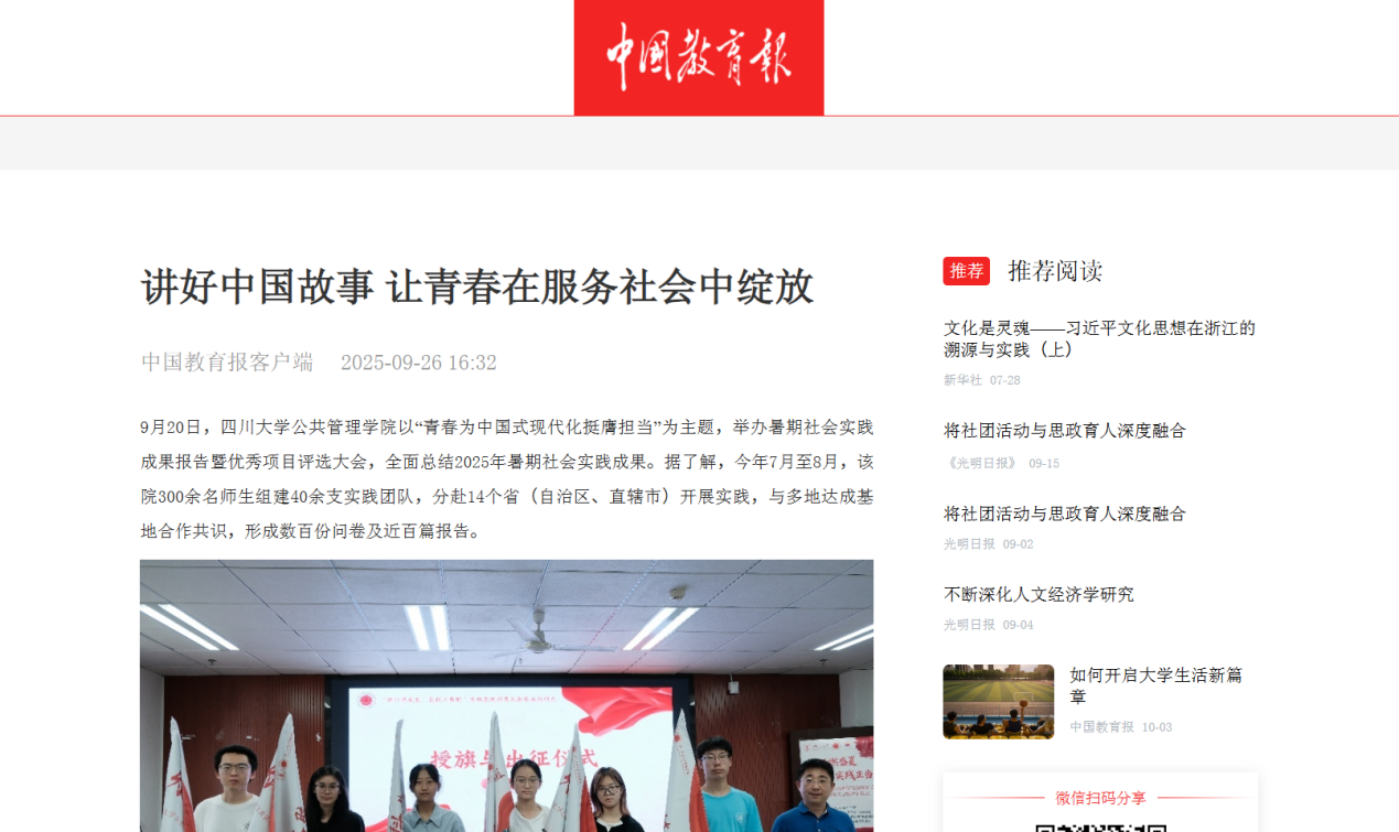 学院党委副书记罗亚玲表示,将持续承担组织、引领、服务青年的使命,引导学子把青春理想融入党和国家事业。学院团委书记刘碧介绍,未来将以价值引领为抓手,围绕基层治理、文化传承等领域,依托“返家乡”“三下乡”等项目推进实践。据悉,川大公管学院已连续多年获评“ok138cn太阳集团暑期社会实践先进集体”,下一步将继续完善实践体系,推动学子在强国建设、民族复兴征程中贡献青春力量。(通讯员 陈宇佟 徐超怡 李方缘)