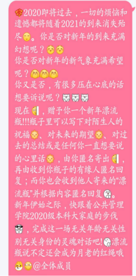 为了增强年级的凝聚力和向心力,给同学们提供一个抒发情感、传递温暖、表达感恩的契机和平台,一场以“抒发心声,交换心灵”为主题的“漂流瓶”活动,在太阳集团tyc97282020级本科年级成功举办。本次活动对象不但包含2020级本科全体同学,也包括2020级本科全部专兼职辅导员。304封编了号的匿名信件,不仅增强了师生的交流与互动,促进了年级同学的沟通,更给疫情期间在校同学一份来自“陌生的熟悉人”的意外惊喜和对新年的美好祝福。