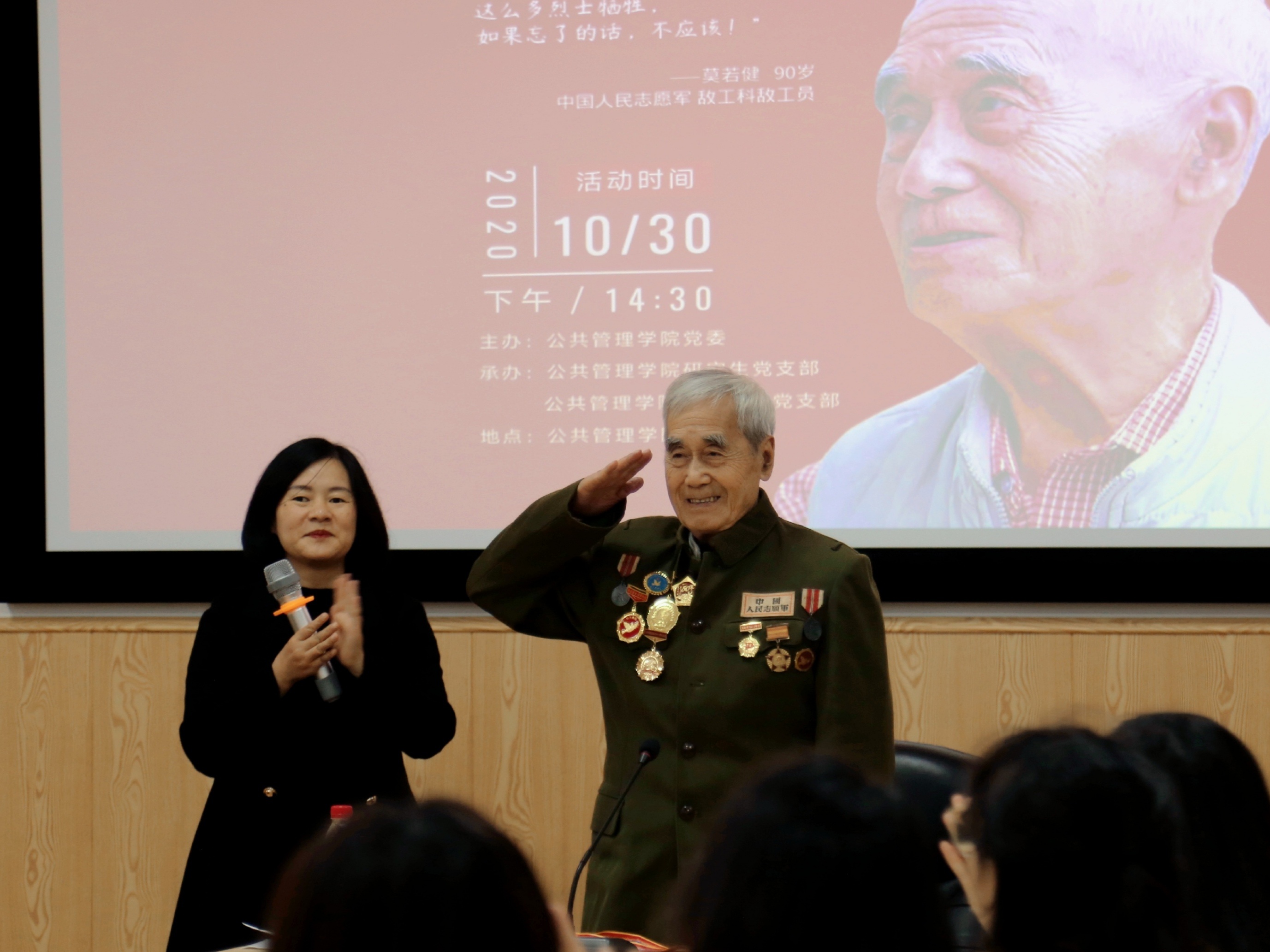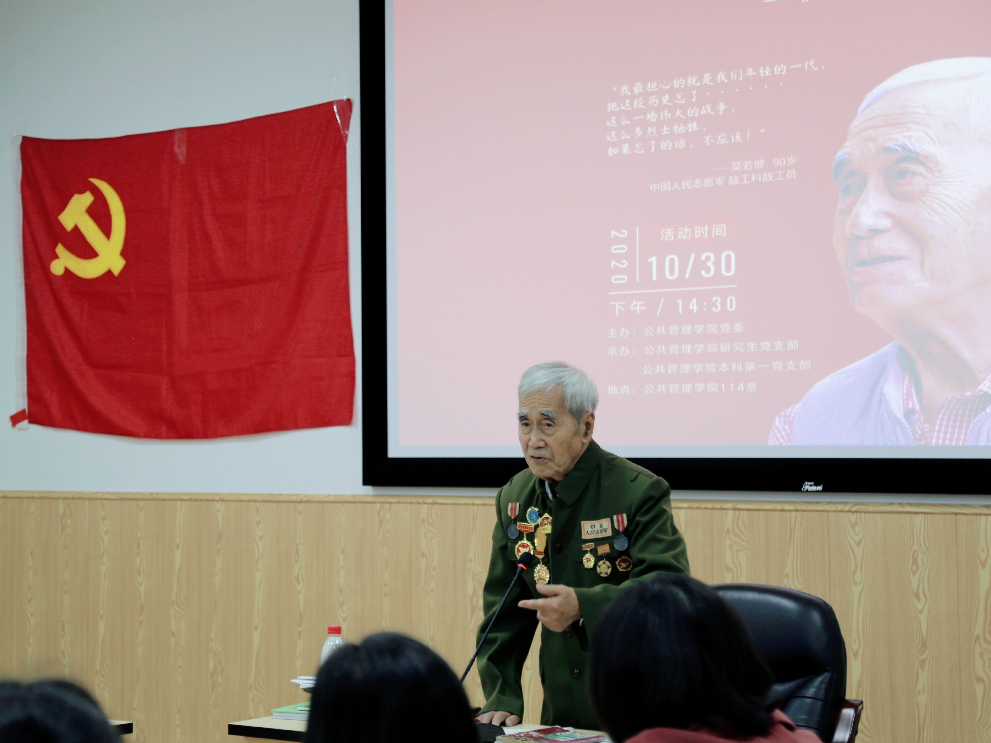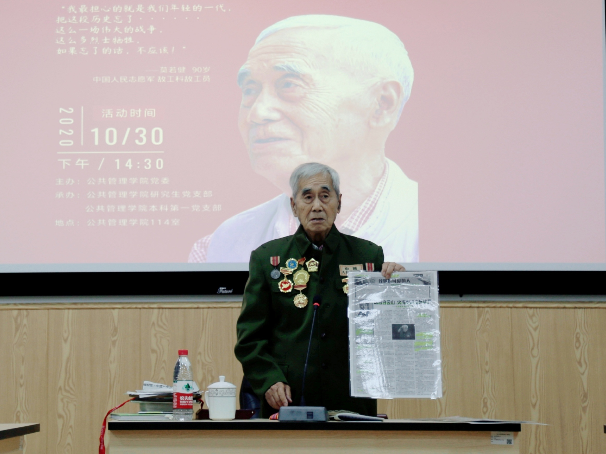 2020年10月30日下午2:30,太阳集团tyc9728“我的战争岁月——抗美援朝老兵莫若健故事分享会”主题党日活动在萃文楼114室成功举办,活动由太阳集团tyc9728副院长罗亚玲主持,学院专职组织员、2019级研究生第四党支部书记廖海燕,2020级研究生辅导员、本科第一党支部书记陈萱源和部分学生党员参加了此次活动。
