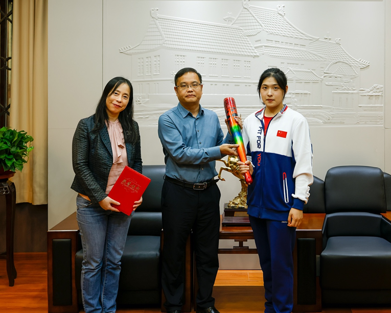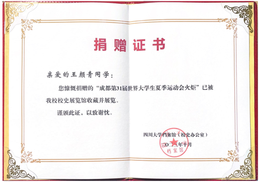 王颜青同学表示,能够以火炬手的身份参与成都第31届大运会是她的荣幸,这次把大运会开幕式火炬捐赠给学校,一方面想表达自己对学校培养的感激,另一方面也希望能激励更多川大人点燃青春梦想,彰显青春担当。