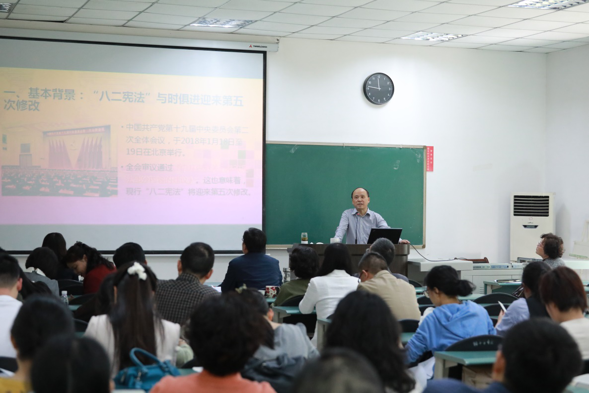 5月11日下午,我院邀请了全国知名法学专家、ok138cn太阳集团法学院院长左卫民教授在萃文楼106室作了《宪法修改和监察体制改革》专题讲座。讲座由学院党委书记姜晓萍教授主持,学院全体教职工党员参加了本次课程。