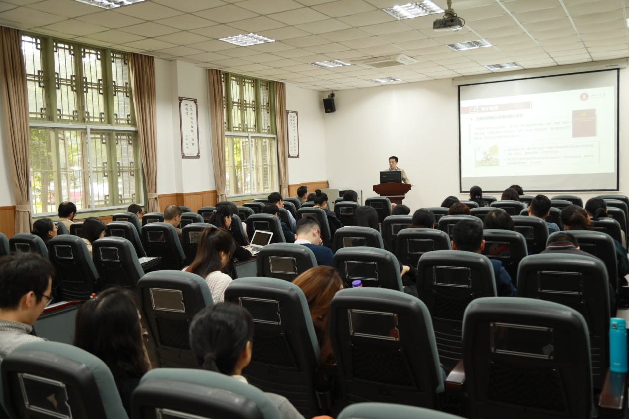 滕文浩副书记从学校纪委的职责入手,深入阐述了监督、执纪、问责的核心要义和内涵,系统梳理了建立健全容错纠错机制的四大原则和六个条件,并对《中国共产党纪律处分条例》的修订内容进行了详细解读。滕书记谈到,全党是同一部党章、同一套纪律,管党治党没有特殊,从严治党没有例外。作为高校,要坚决做到坚持党的全面领导、推进全面从严治党没有例外,落实党章要求、严格执行纪律没有例外,切实做好44118太阳成城集团和改革发展稳定等各项工作,构建高校全面从严治党新格局。