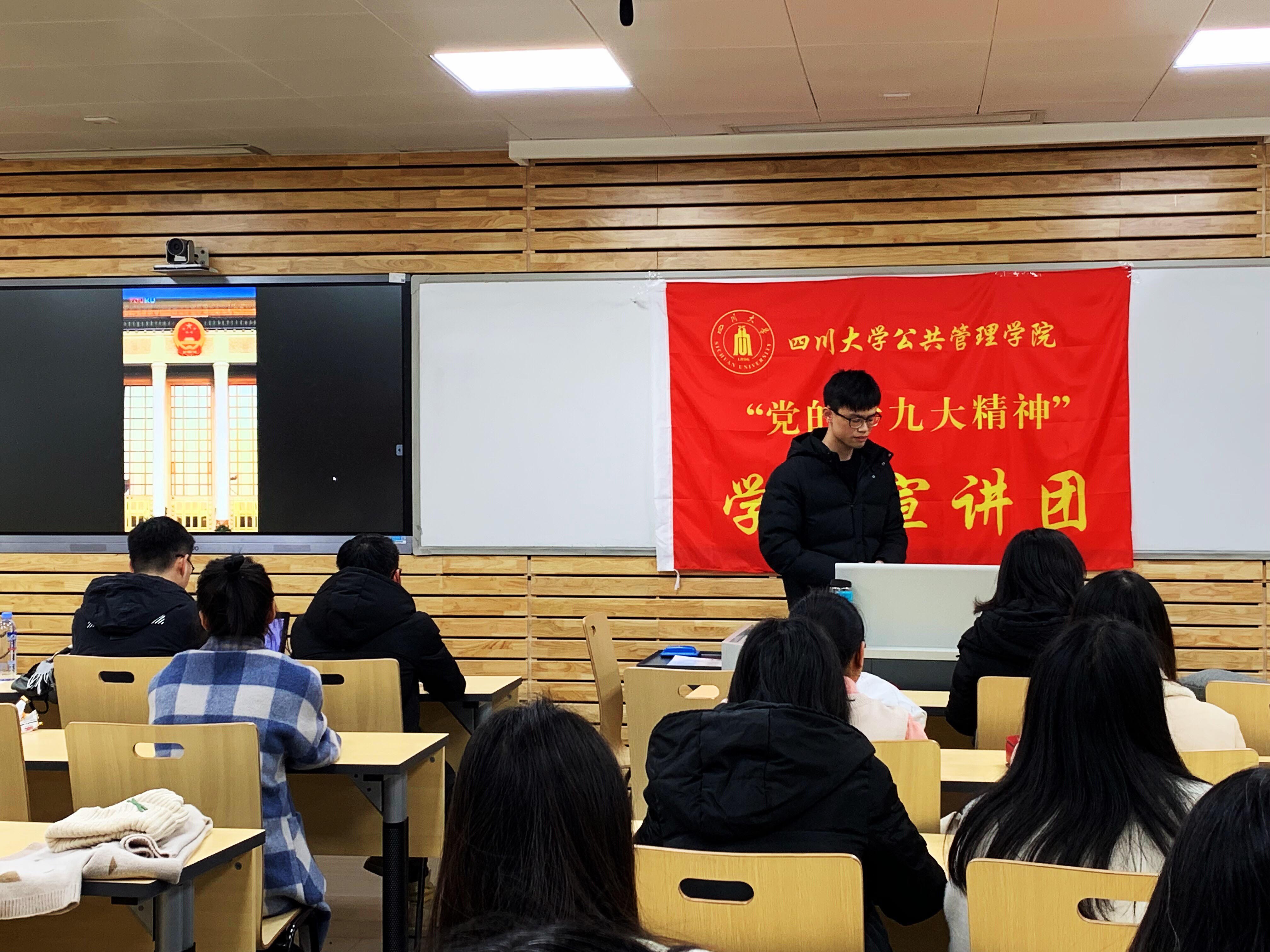 随后,法学院的学生党员谢正辉同志和邱奕同志先后围绕“弘扬爱国奋斗精神,做新时代青年楷模”做了主题宣讲。两位党员同学将十九大精神与我国的法治建设融合,从新时代呼唤新青年、新青年如何坚定爱国信念、新青年如何实现中国梦三个方面,以法律的独特视角对十九大报告做了系统而全面的宣讲和阐释。并重点对作为实现“全面依法治国”支柱的我国七大法律部门——宪法及宪法相关法、民法商法、行政法、经济法、社会法、刑法、诉讼与非诉讼程序法进行了深入浅出的讲解,赢得了同学们一阵又一阵热烈的掌声。